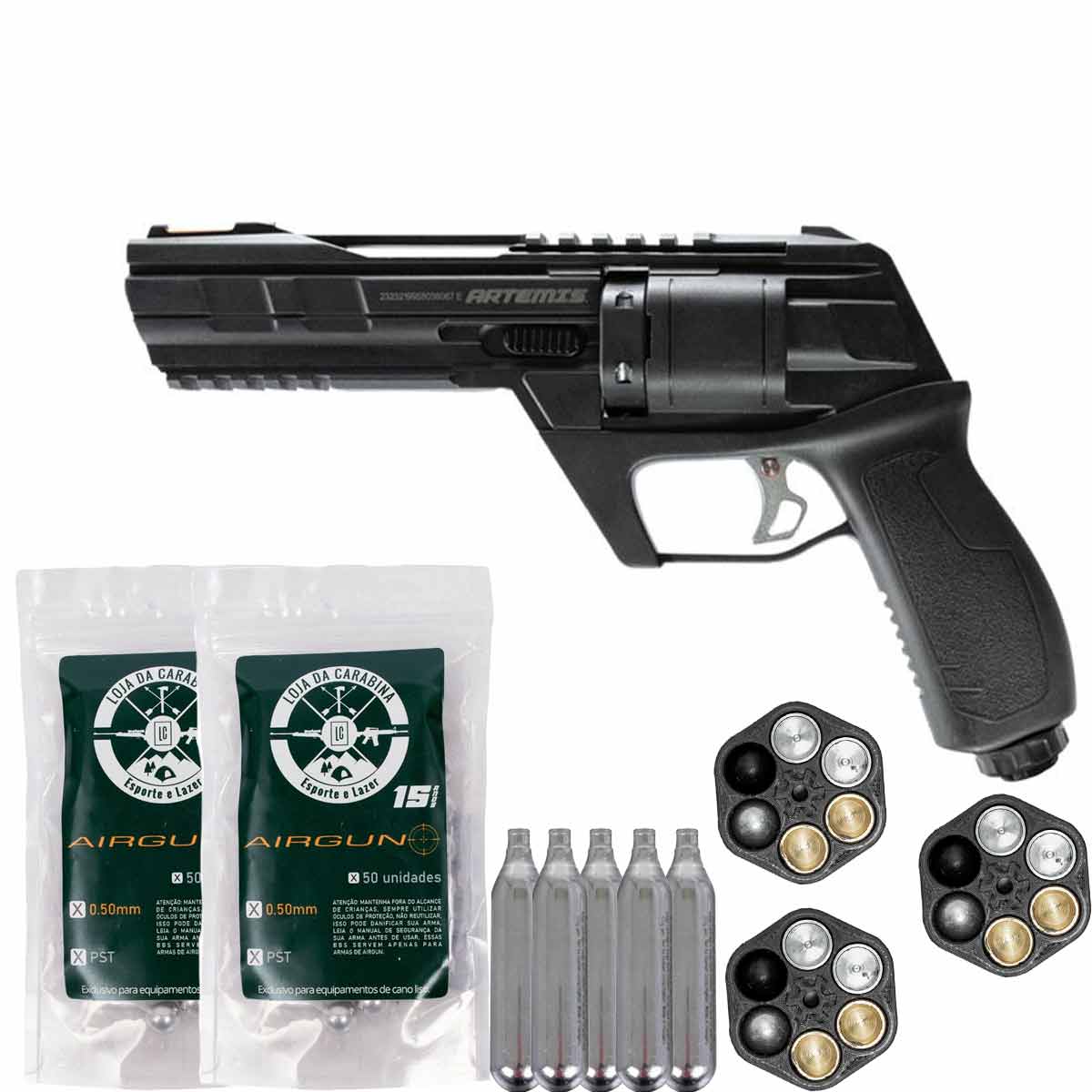 Revólver Paintball Co2 Artemis CP300 Defender .50 + Magazine 3D LC + Esferas 100Un + 5x Co2