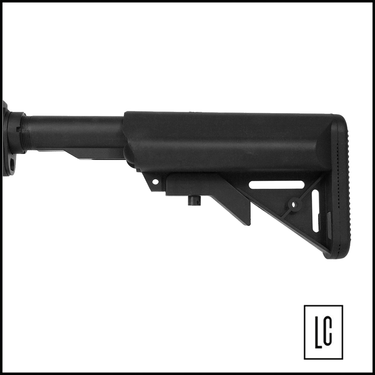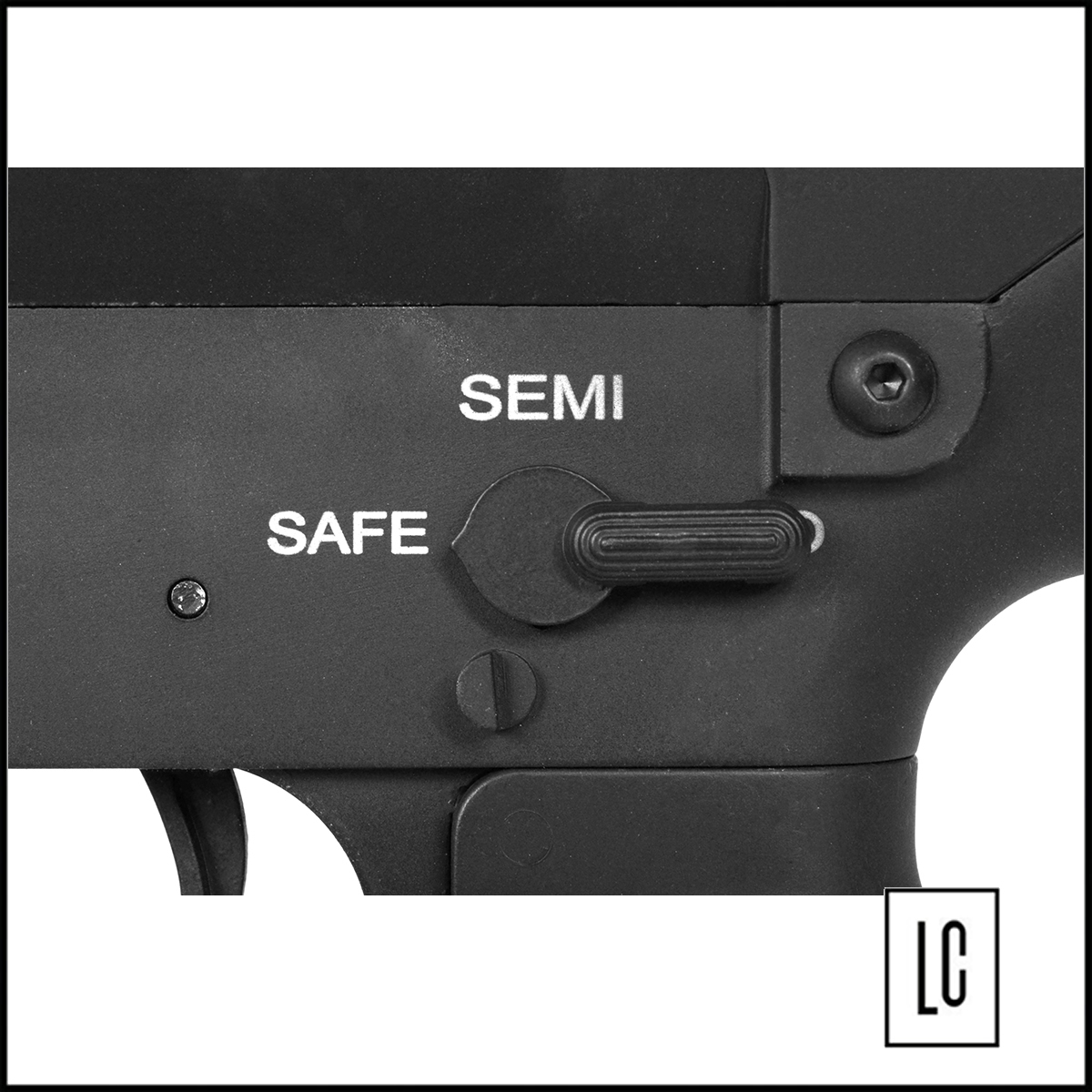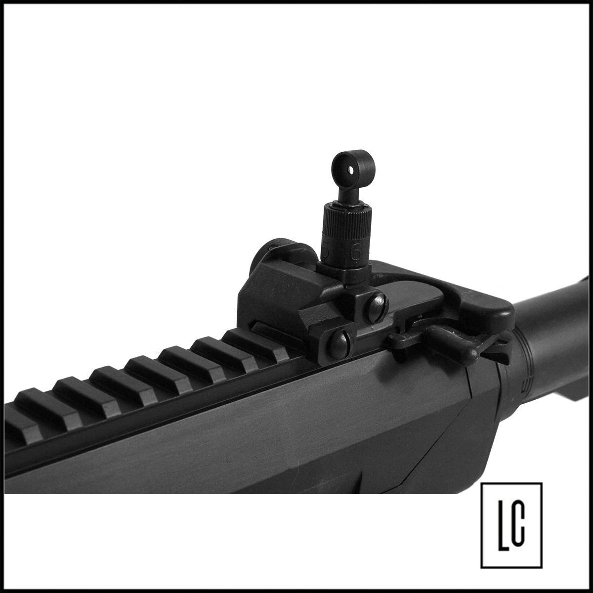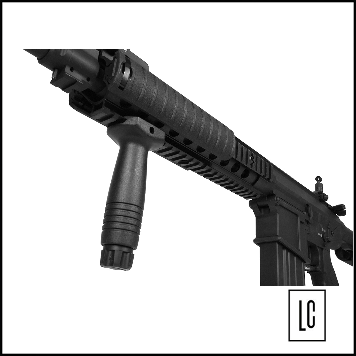 Esta AEG conta com trilhos para fixação de bipés, punhos (fore e front grips), acessórios óticos etc. O modelo também possui botão ambidestro para liberação do magazine.