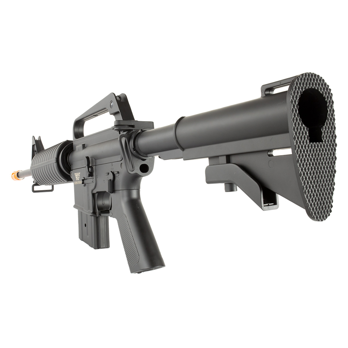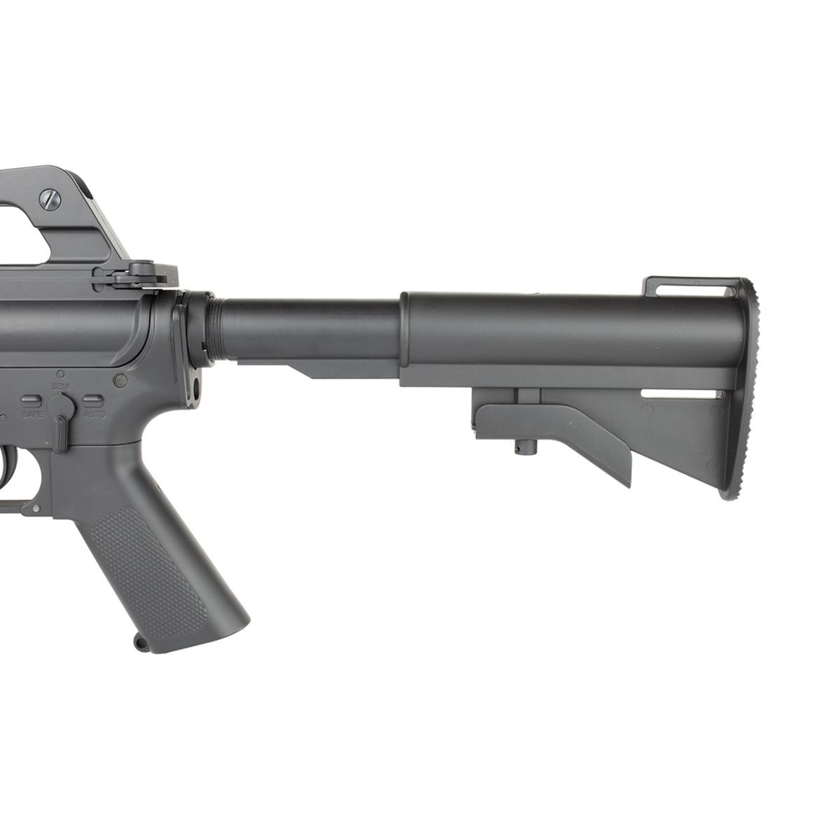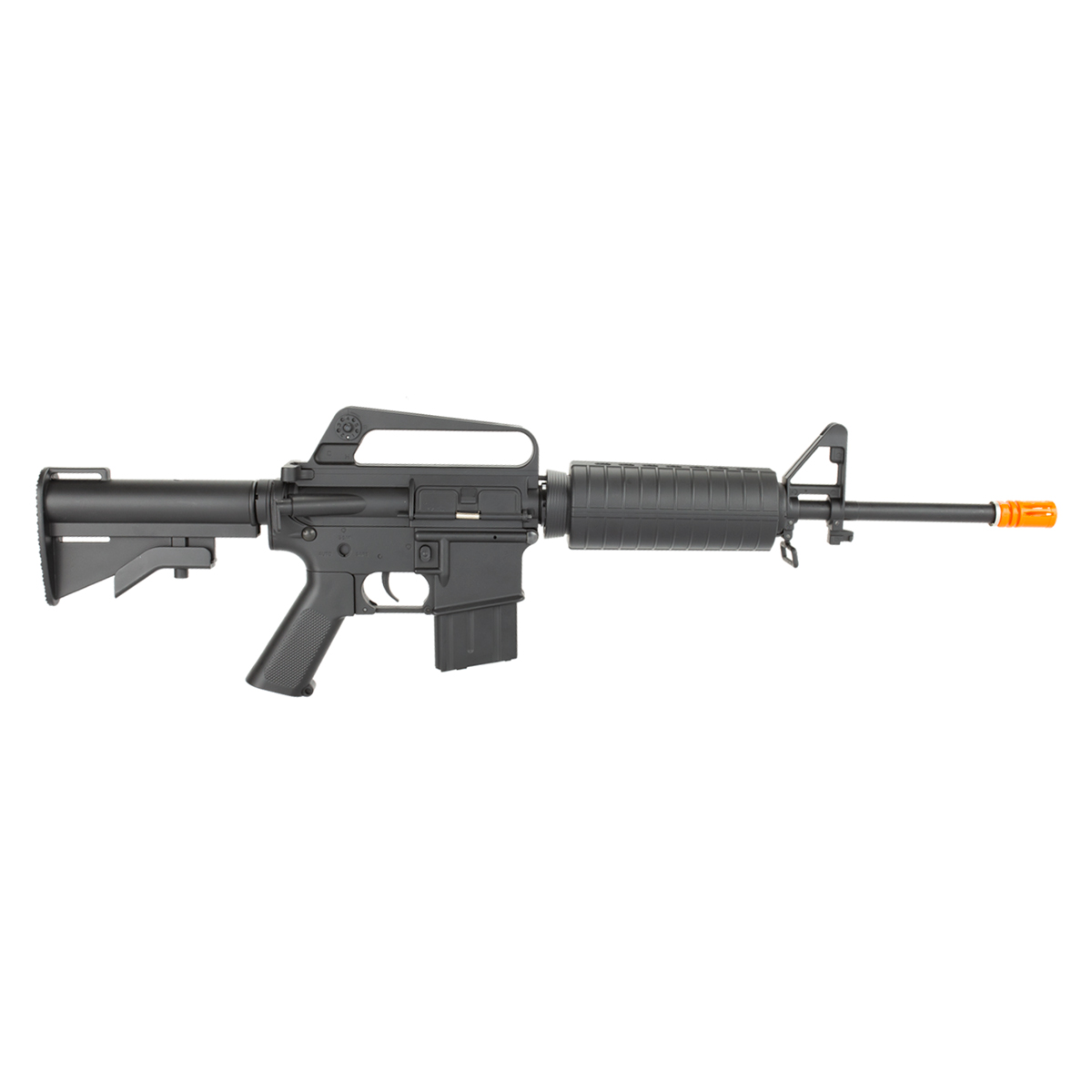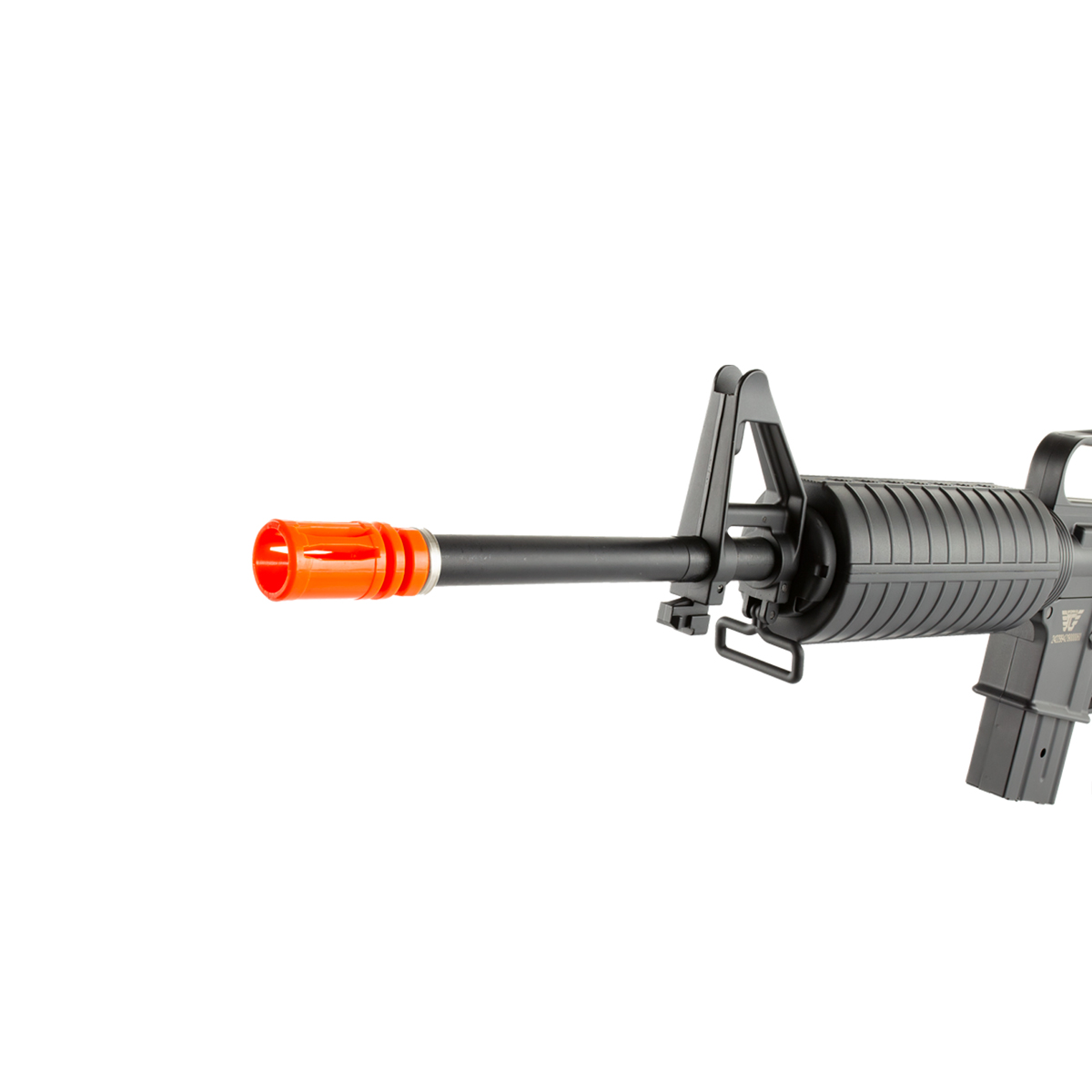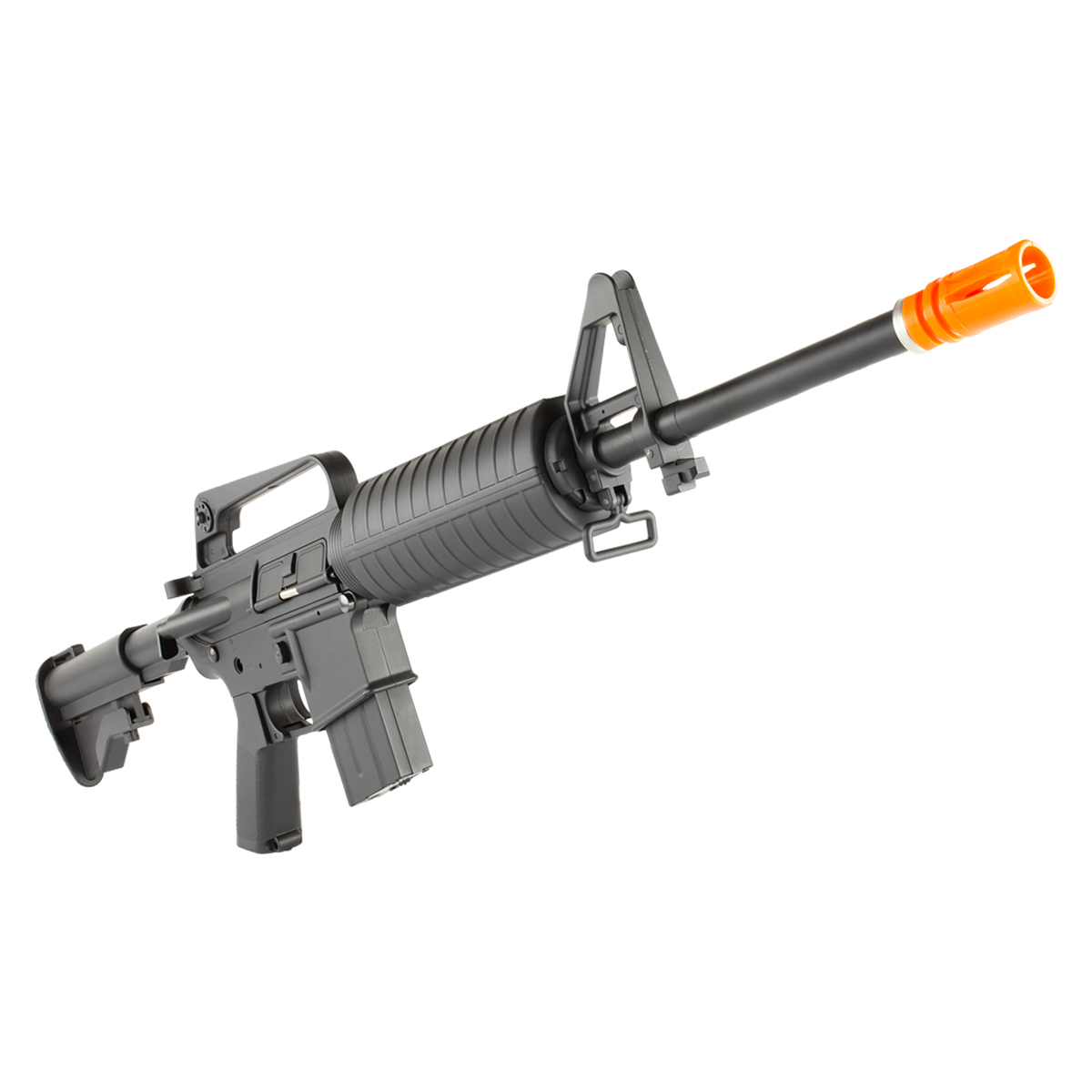 Esse Rifle M4 na cor preta, conta com um carry handle fixo, que facilita o transporte.