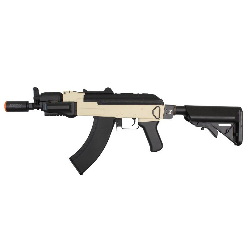 Este Airsoft Rifle - AK SPETSNAZ DUAL, todo customizado pela Actionx, na cor Preta e Tan, dando um design totalmente diferenciado desta Arma de Airsoft. Tem gravação a laser, coronha crane retrátil e ponteira Flash Hider, que amplifica o som do disparo.