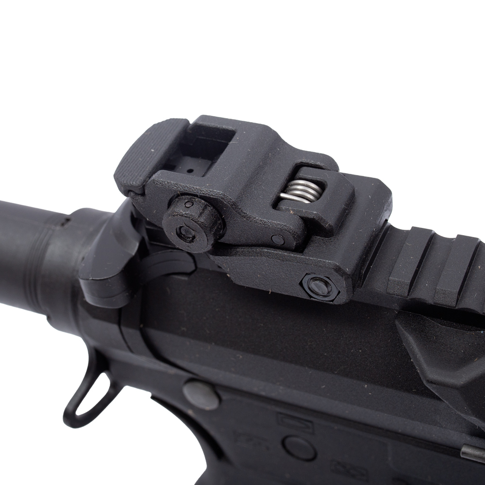 Sua alça e massa de mira são rebatíveis por mola.