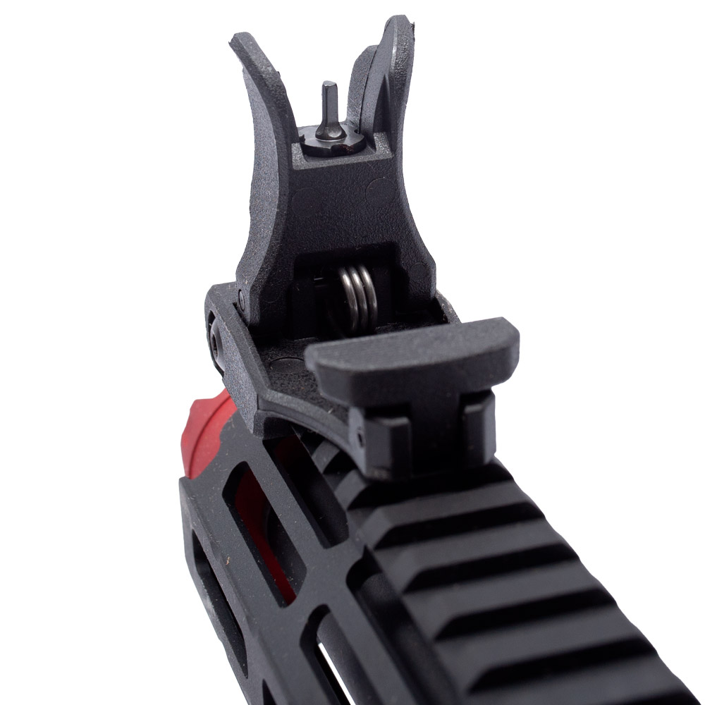 Conta com cano de precisão 6.03mm e flash hider em metal na cor vermelha.