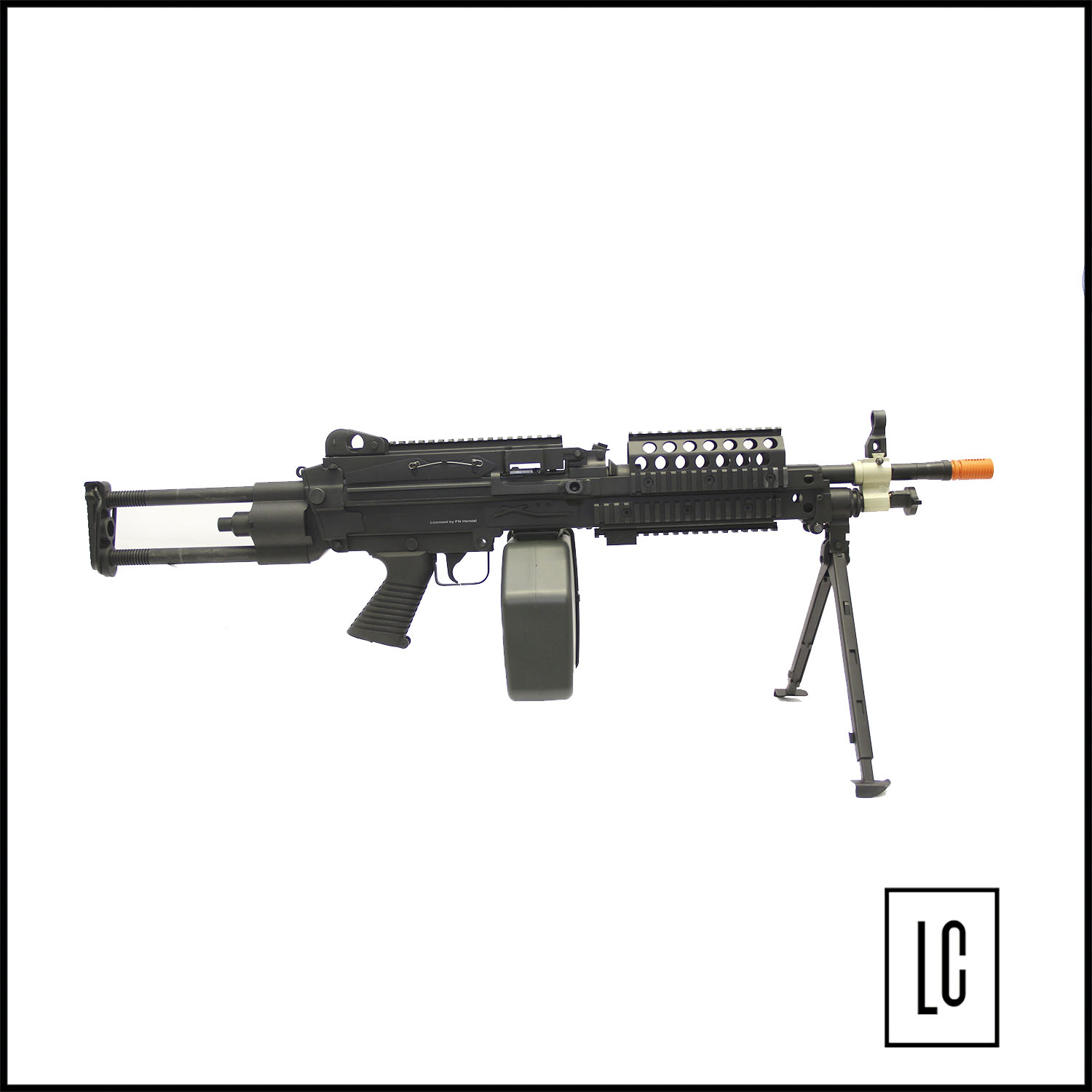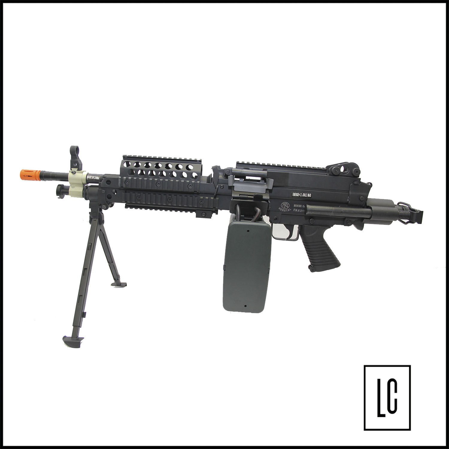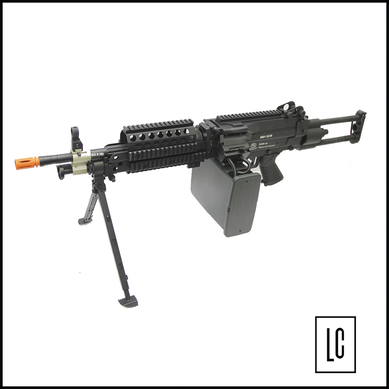 RIFLE DE AIRSOFT MK46 MINIMI é um modelo em full metal desenvolvido pela CYBERGUN. Equipamento licenciado pela FN Herstal possuindo as marcações originais no corpo, tal qual a versão original. Possui coronha ajustável, mira regulável, alças para adaptação de bandoleira, pega mão, sistema de disparo automático e trava de segurança, sistema de Hop-Up ajustável BAXS System, modelo já acompanha drum e se destaca pela alta cadência no disparo, permitindo uma supressão pesada nos jogos de airsoft.
