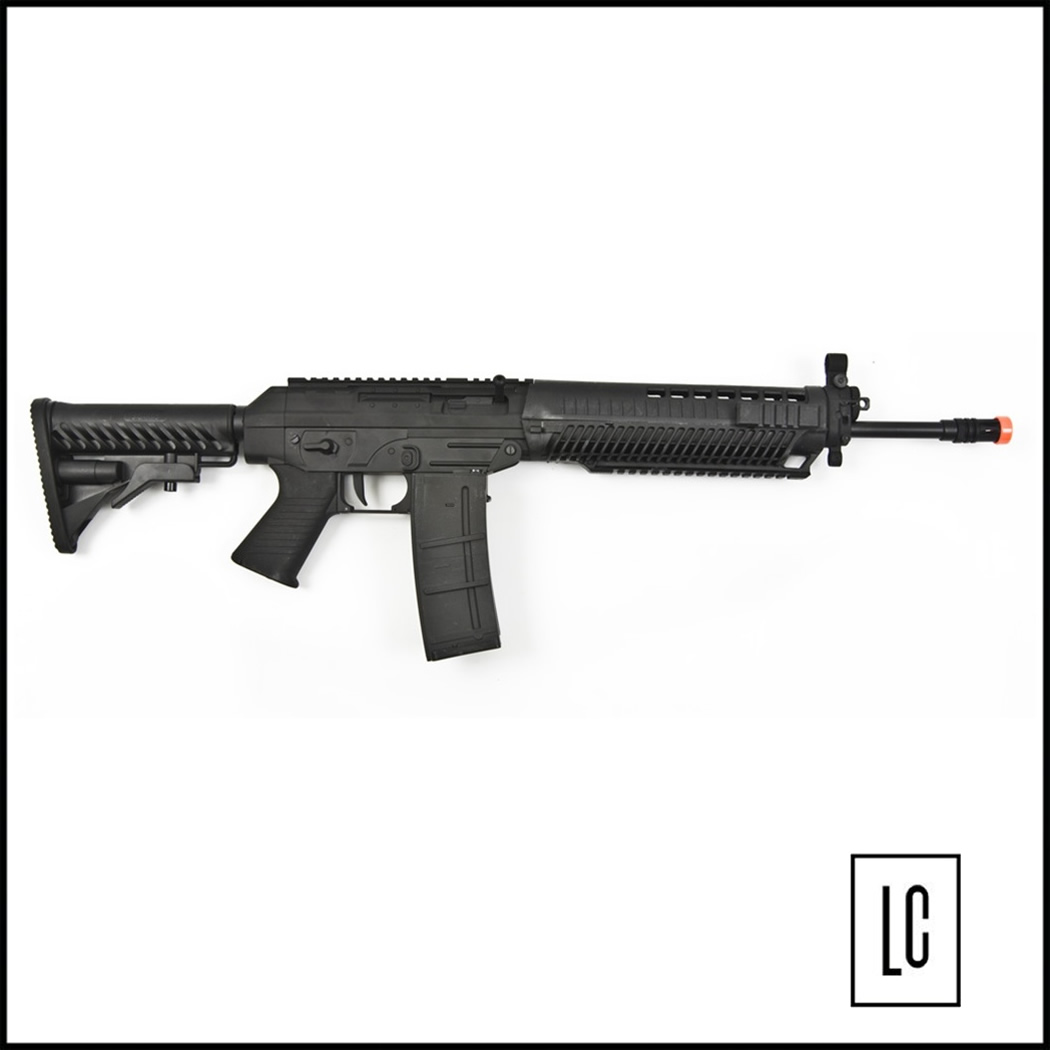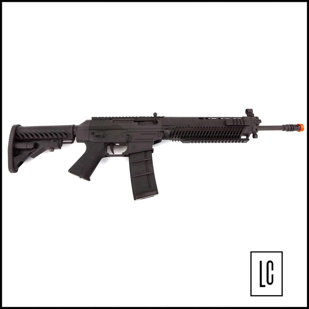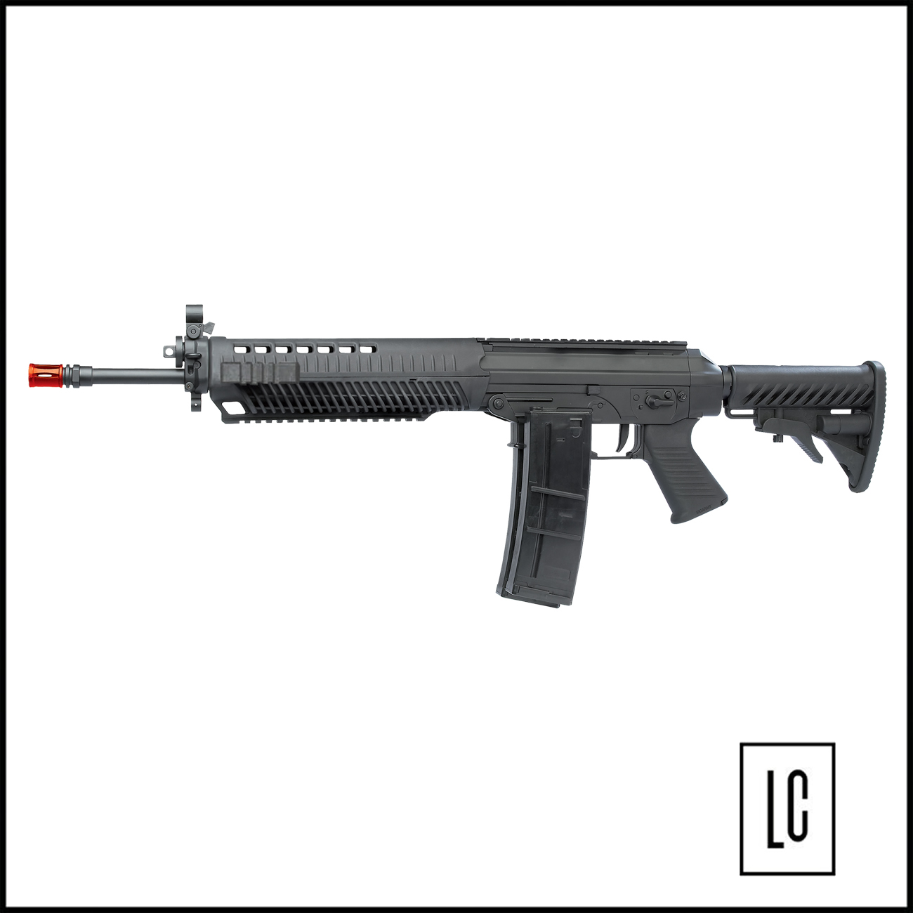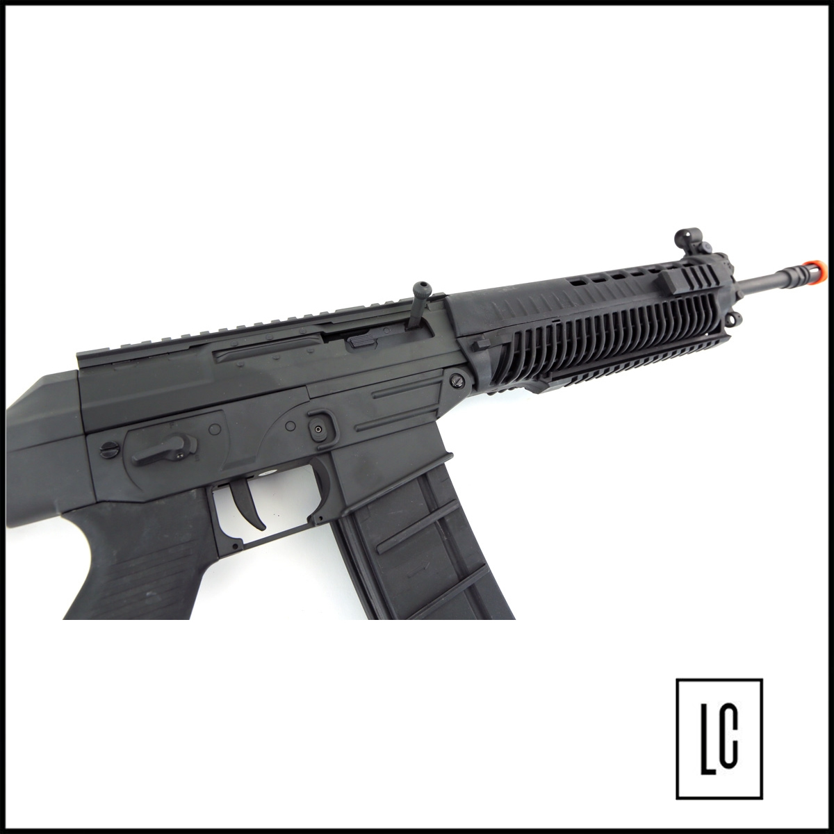 RIFLE DE AIRSOFT SIG SAUER 556 é um modelo elétrico, distribuido pela Cybergun no calibre 6mm. Modelo com função semi automatico e automatico, possui mira regulavel, suporte para bandoleira e trilho superior de 22mm, modelo com diferencial possuindo 1 magazine de fabrica, possui sistema de Hop Up ajustável, coronha retrátil.