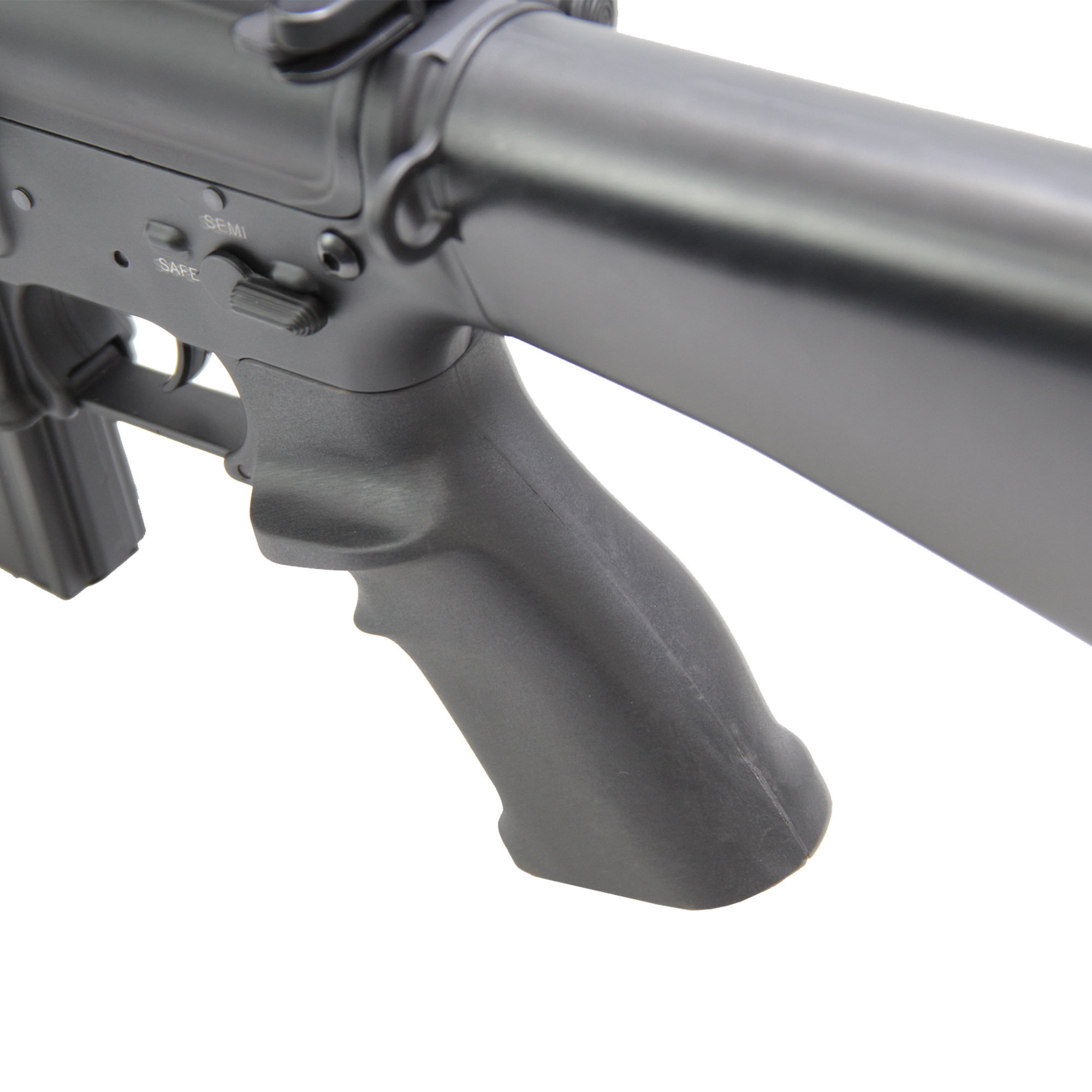 Possui ejetor do magazine ambidestro, coronha fixa e miras ajustáveis.