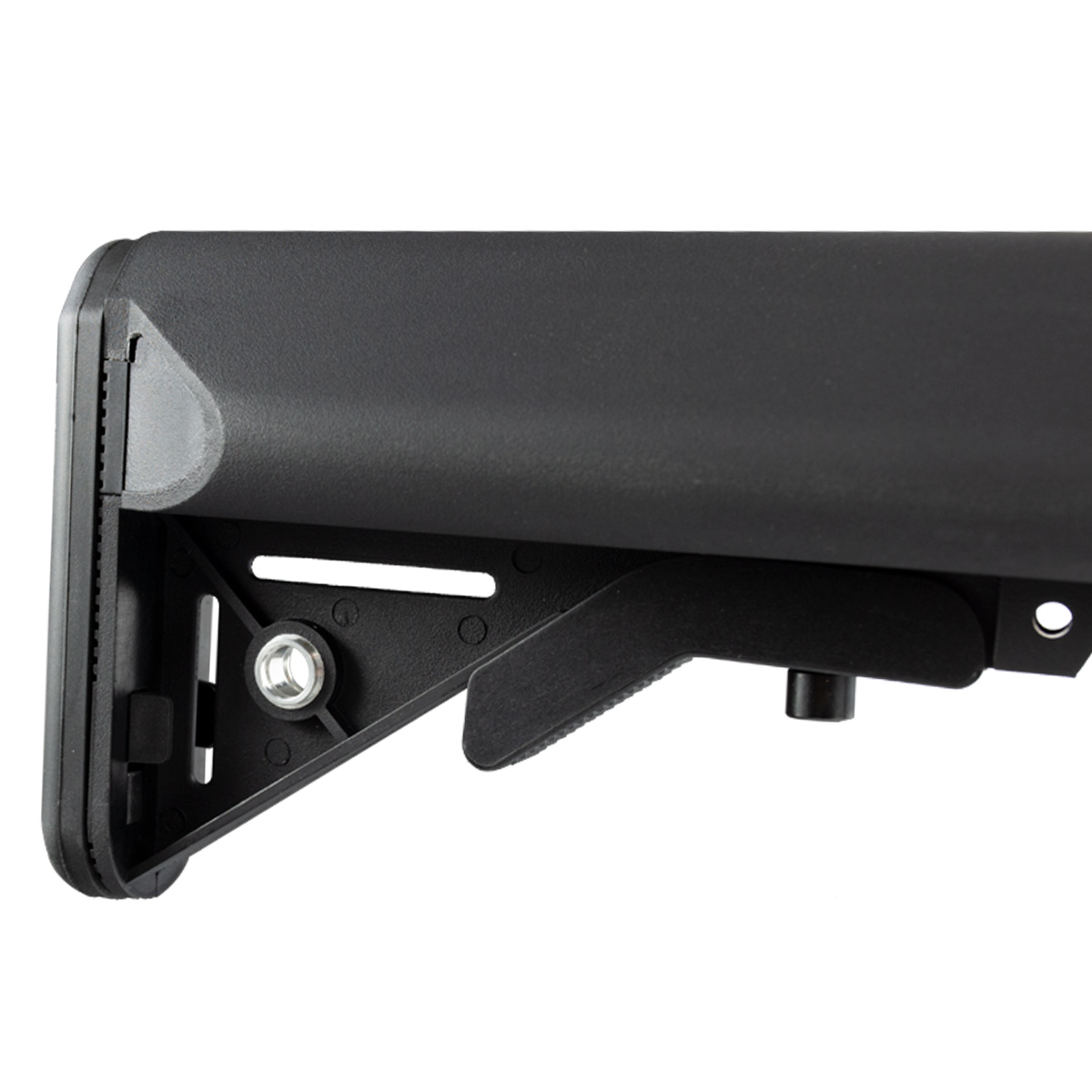 Conta com uma coronha retrátil, onde você pode ajustar o comprimento total do rifle, entre no mínimo 81,2cm e no máximo 89,5cm.