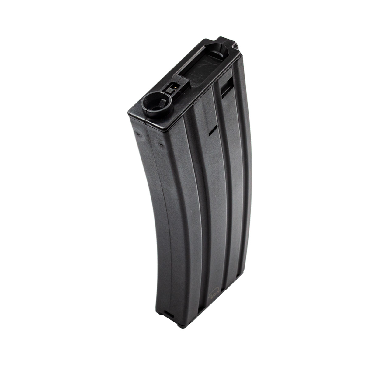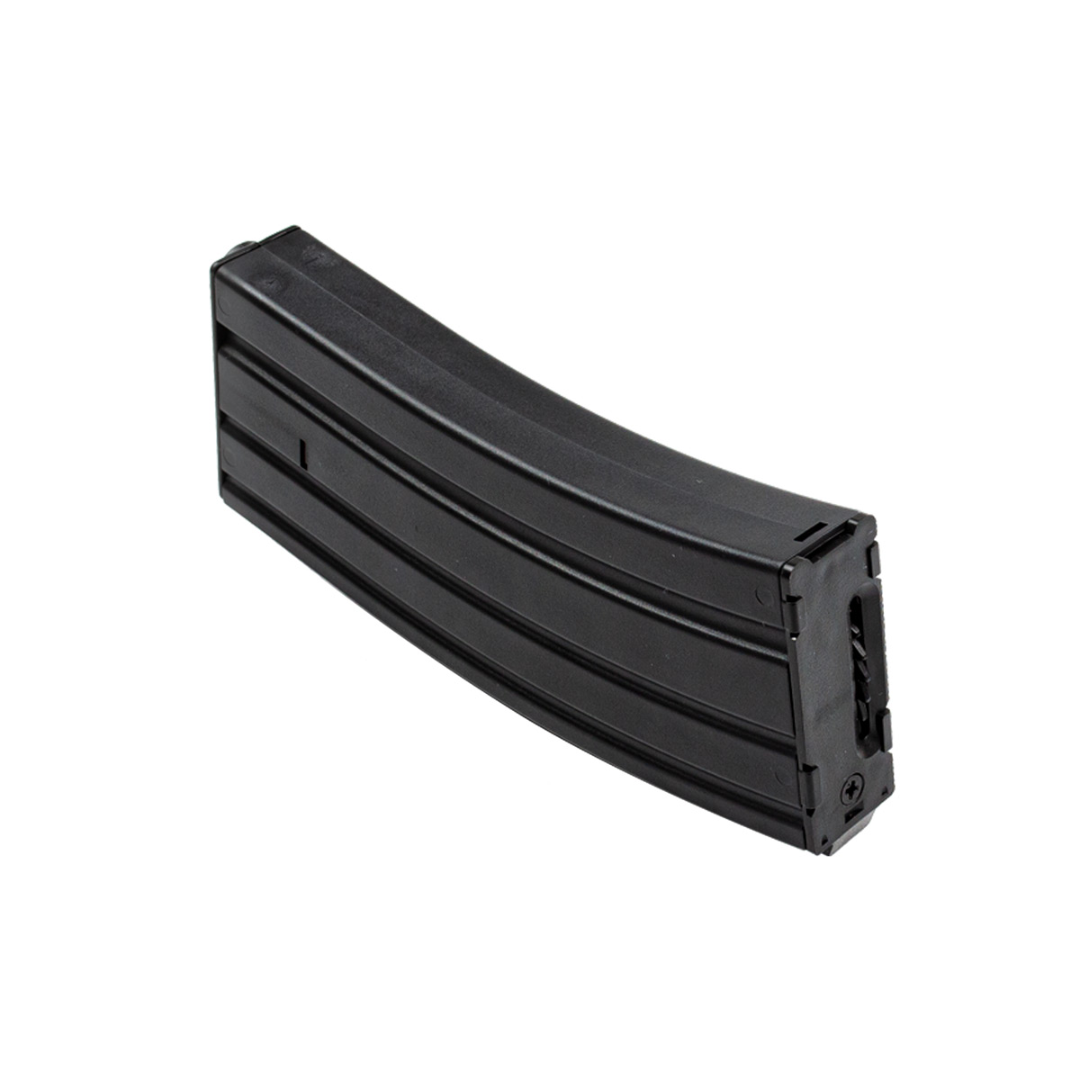 Tem um alcance de mais ou menos 50 metros. Seu magazine tem capacidade para até 300 BBs.