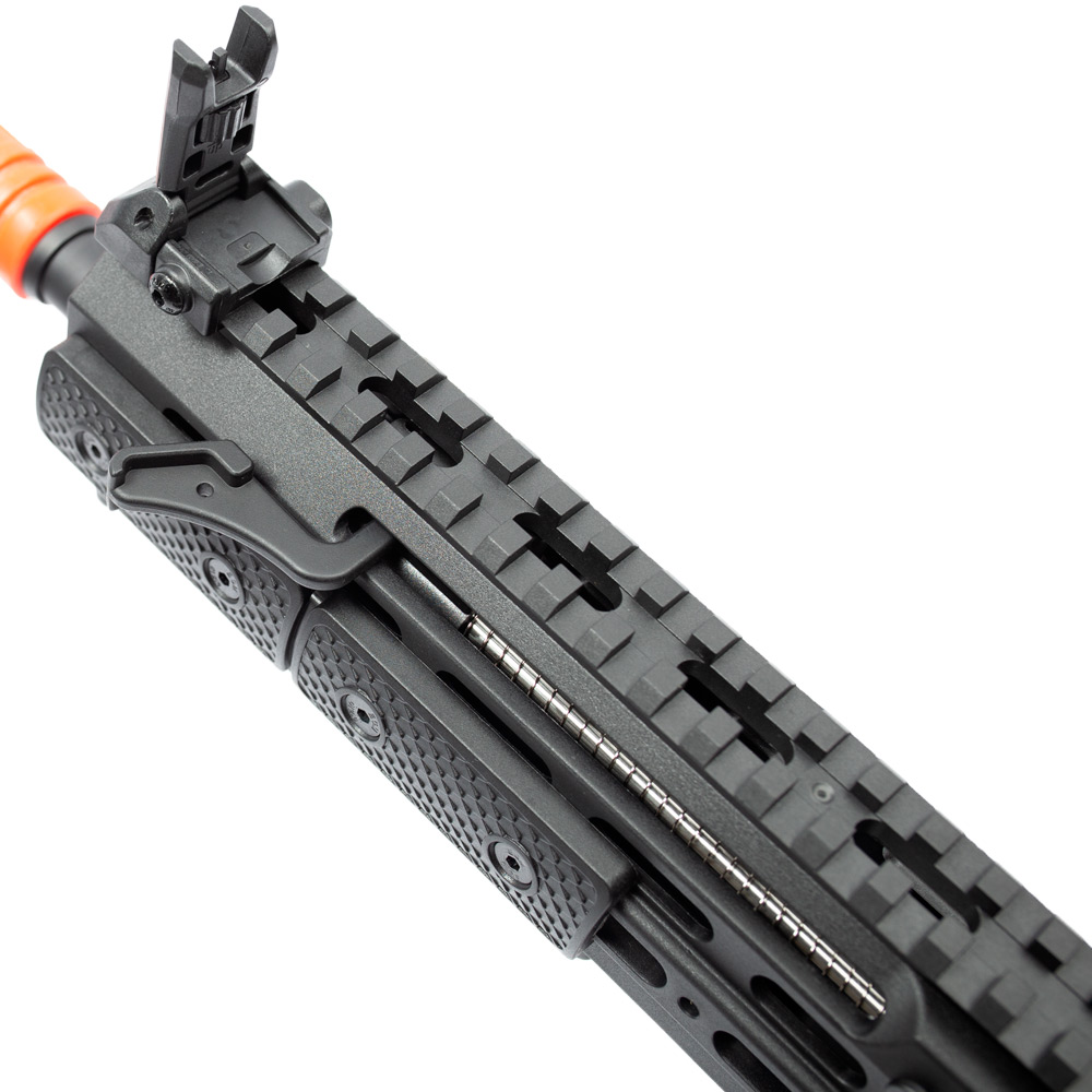 Permitindo grandes possibilidades de customização, o Rifle Orion M917G possui trilhos na parte superior de 20 mm picatinny e nas laterais, além de encaixes m-lok, assim você poderá acoplar diversos acessórios com facilidade na sua AEG. Acompanha capas para os trilhos caso não queira utilizar os trilhos laterais, e assim terá maior conforto na empunhadura.