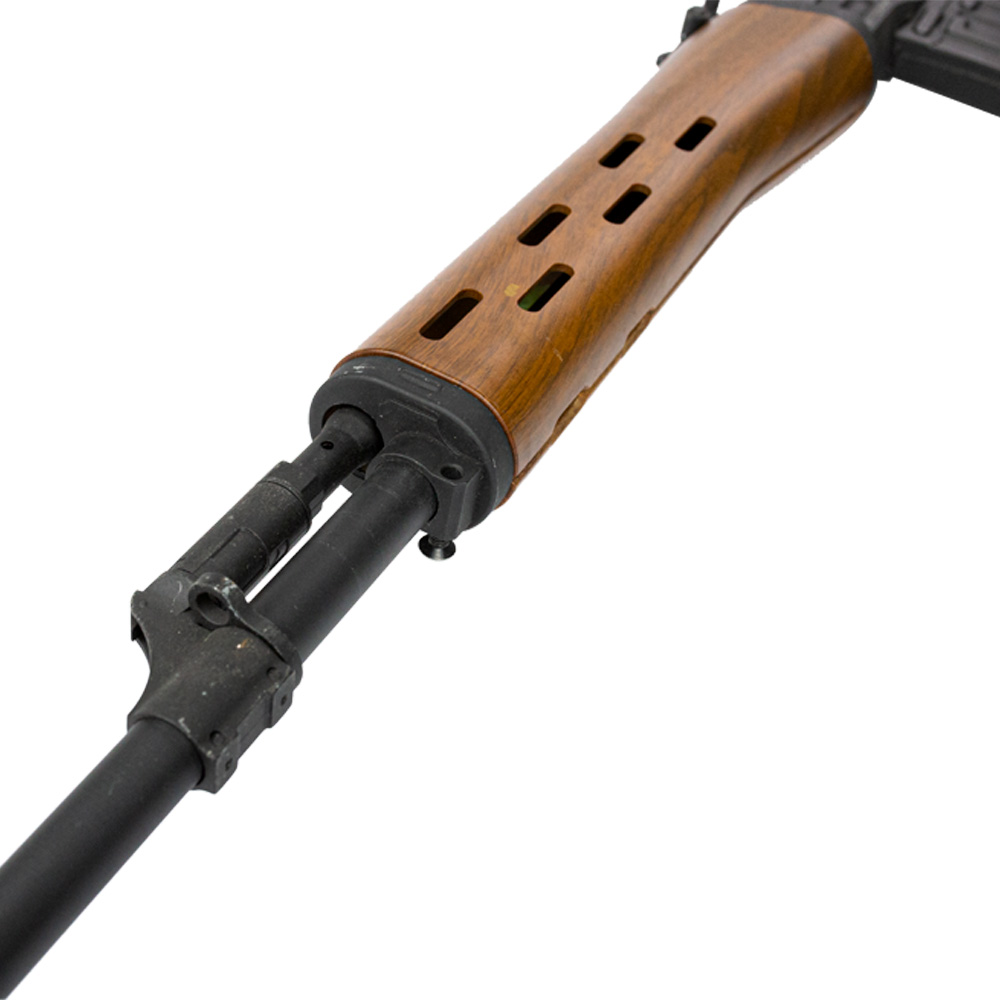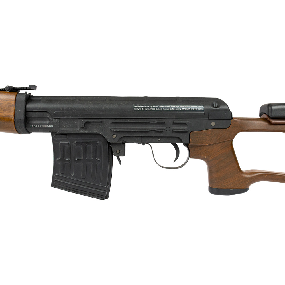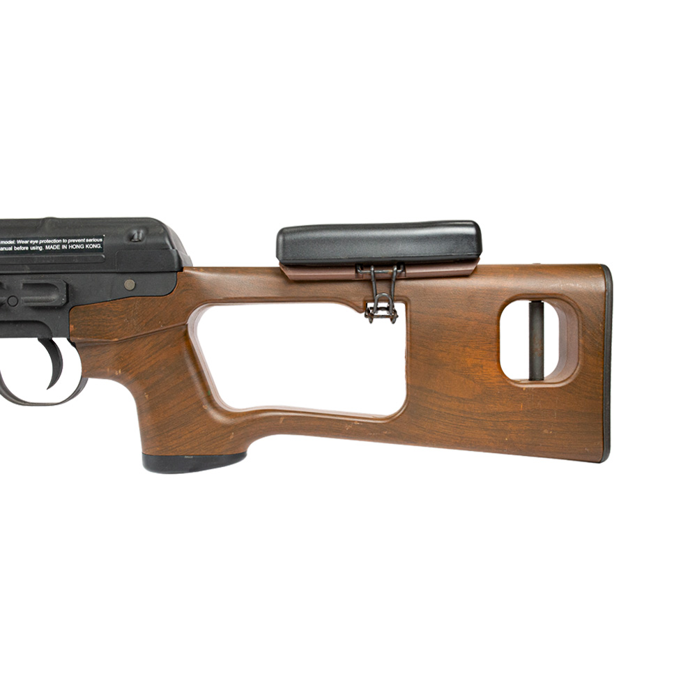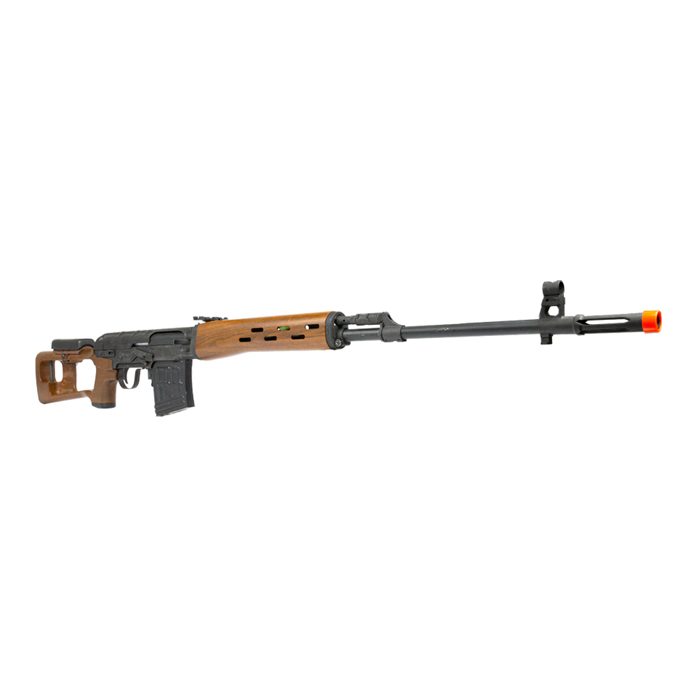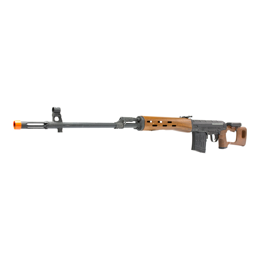 Rifle AK Dragunov com ação elétrica com modo de disparo semi-automático e full automático. Também possui modo safe.