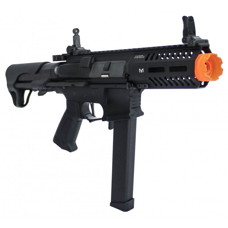 Rifle ARP-9 com acabamento em fibra nylon que a torna leve e resistênte. Com Mosfet, ETU (3 tiros) e gatilho eletrônico que alem de maior desempenho, permite uso de baterias de maior desempenho.