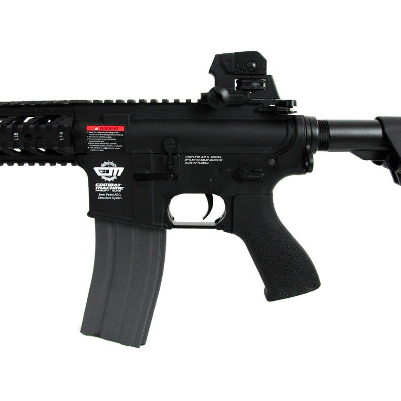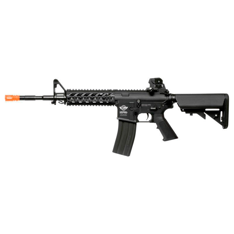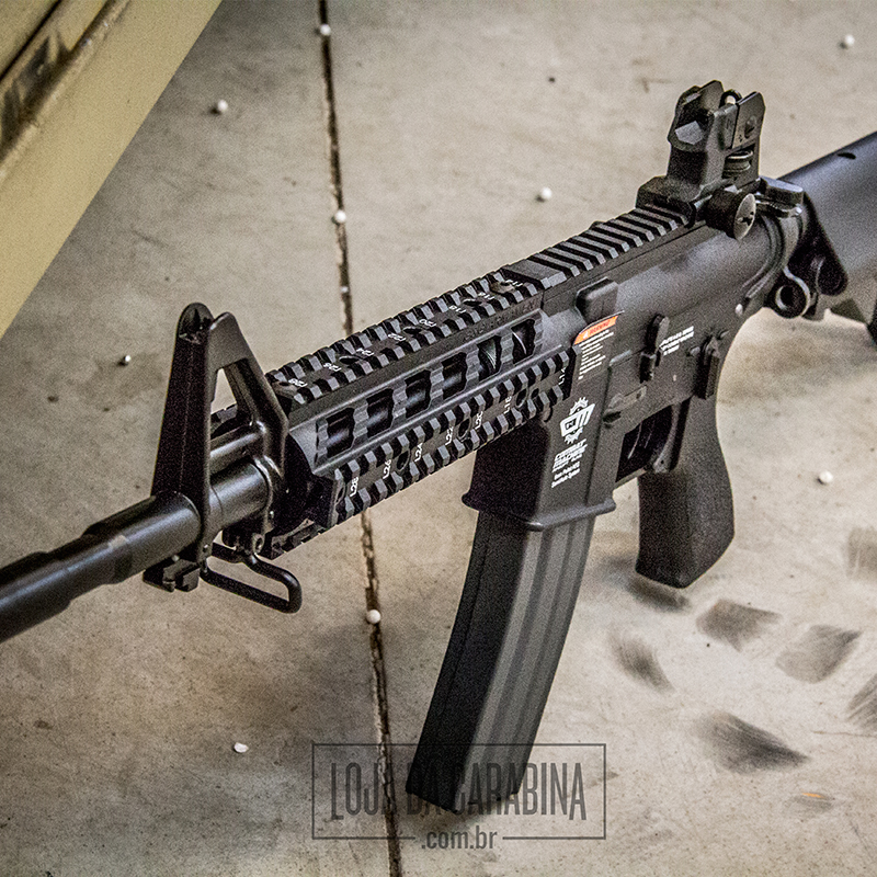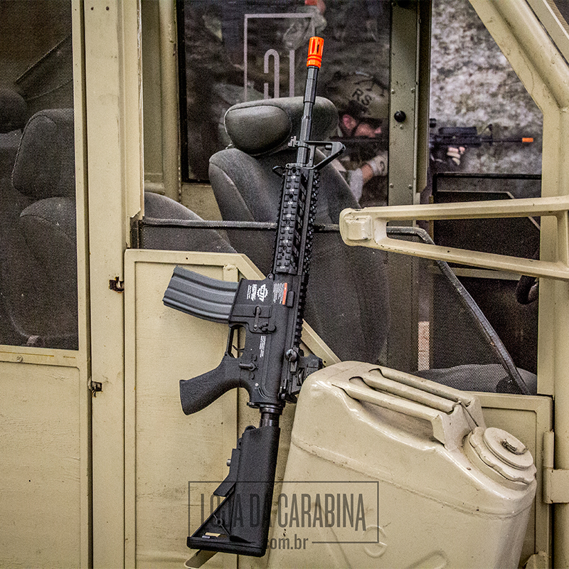 Rifle de extrema qualidade com excelente relação custo-benefício. Constituido em metal e polímero de alta densidade, possui trilho RIS 20mm, gear box de metal com engrenagens de aço, coronha modelo Crane ajustável em 5 posições, magazine Hi cap para 350 bbs, pontaria ajustável com massa de mira removível e zarelho para bandoleira. Possui hop up ajustável e é um modelo elétrico com carregador de baterias bivolt.