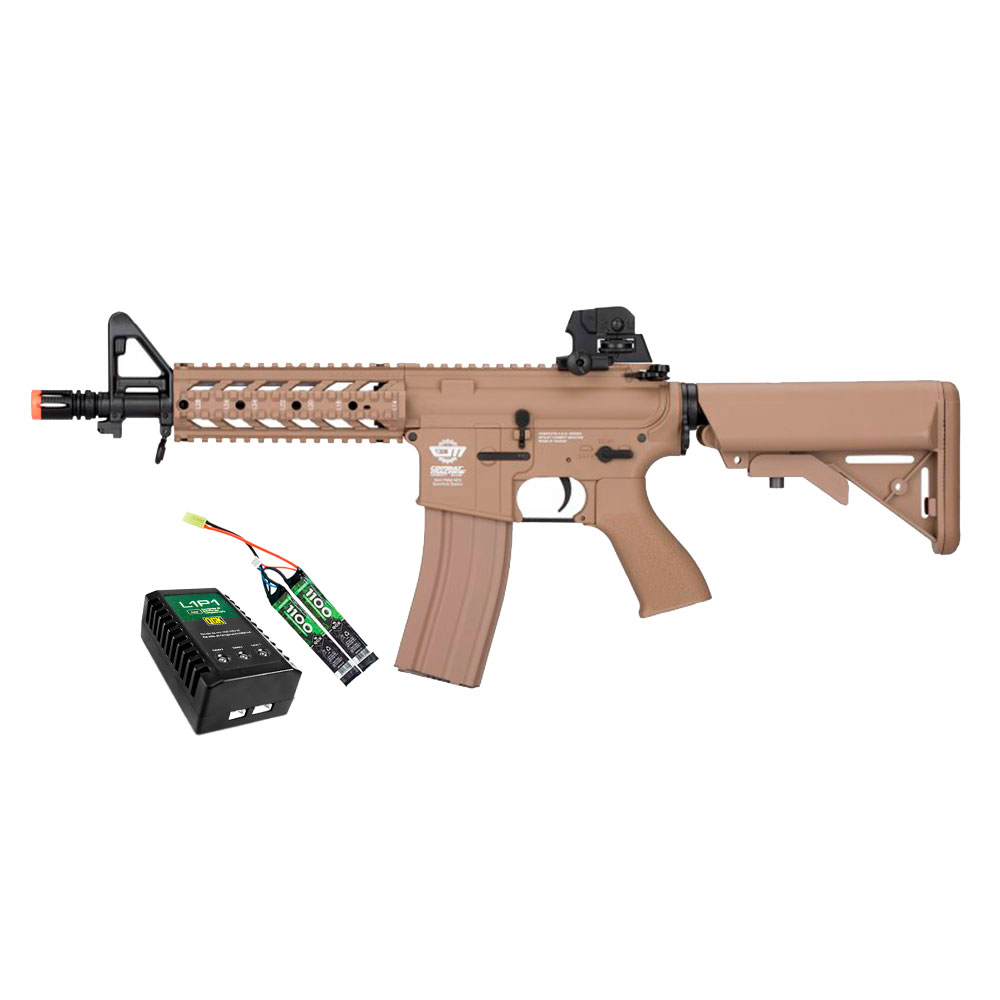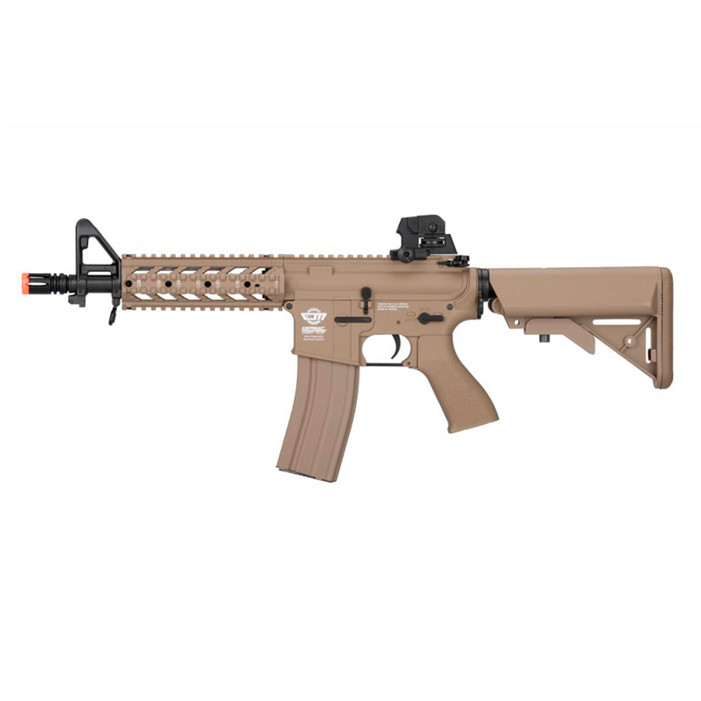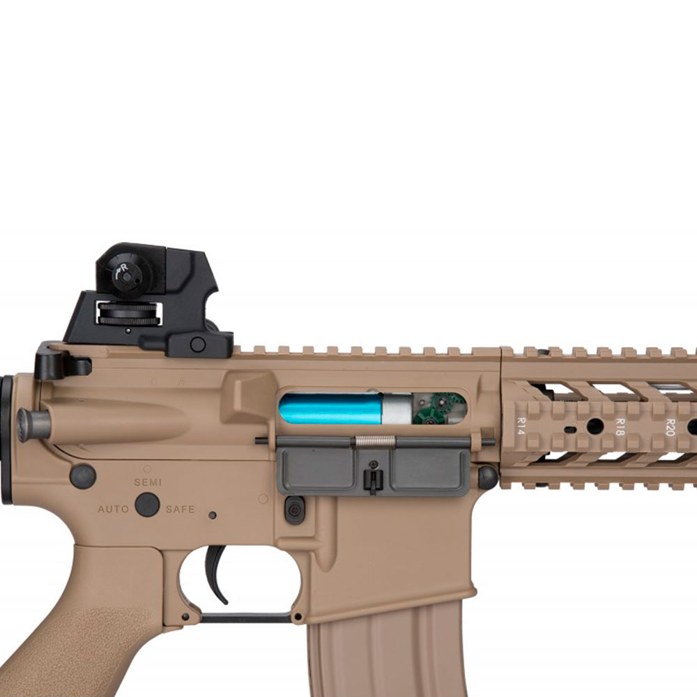 RIFLE DE AIRSOFT G&G CM16 RAIDER é um modelo baseado Colt M4RIS, comum nos Estados Unidos. Possui coronha retrátil onde é possível ajustar o comprimento do equipamento para melhor ajuste do atirador. Possui mira regulável em 2 modelos com ajuste lateral e vertical, alça de mira com ajuste de elevação, coronha ajustável, alças para adaptação de bandoleira, sistema de disparo automático, semi-automático e trava de segurança, sistema de Hop-Up ajustável BAXS System e sistema com trilhos no handguard.