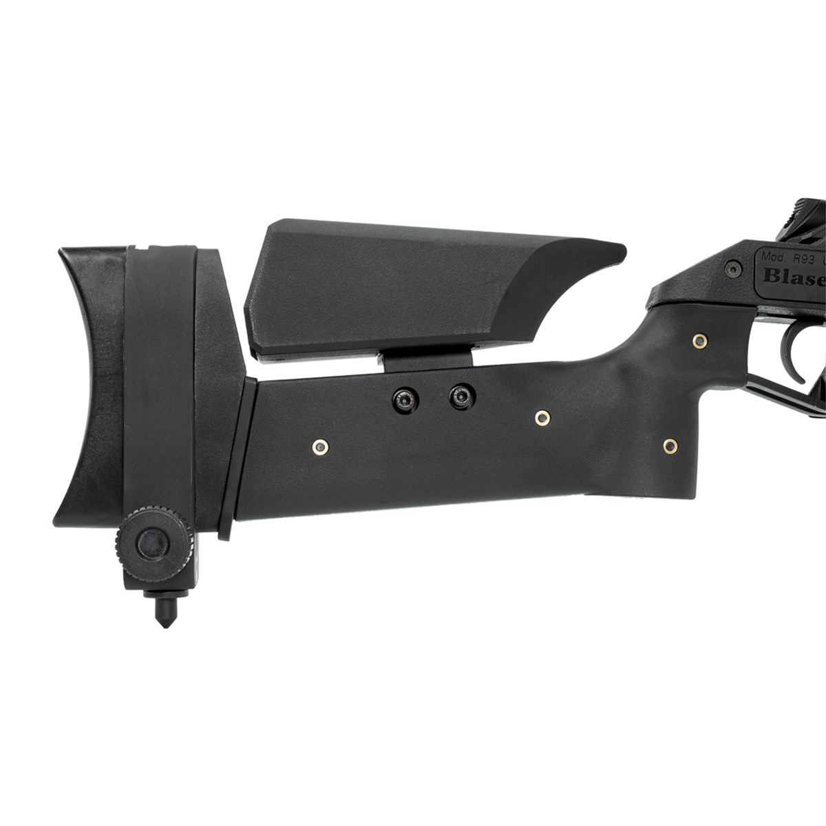 Um dos seus diferenciais é o monopé traseiro (fica junto com a coronha), você pode ajustá-lo dependendo da sua posição de tiro. Ele é do tipo agulha, que serve para "cravar" no terreno promovendo uma estabilidade maior para o disparo.
