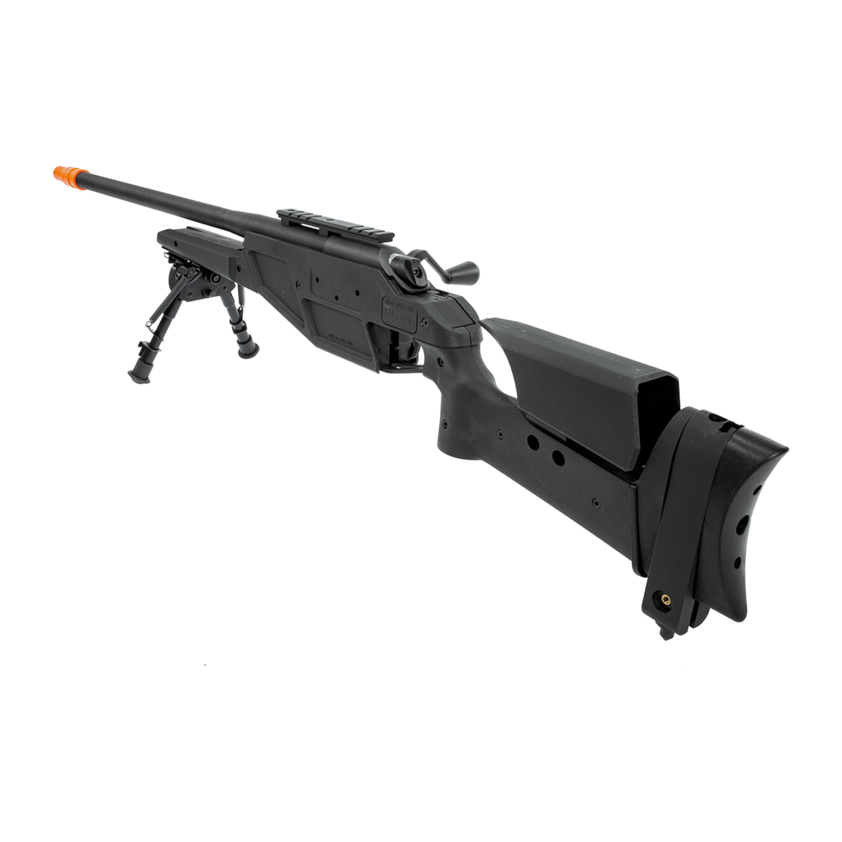 Arma de Airsoft com sistema de disparo tiro a tiro, ação por mola. Basta puxar o ferrolho para trás e disparar.