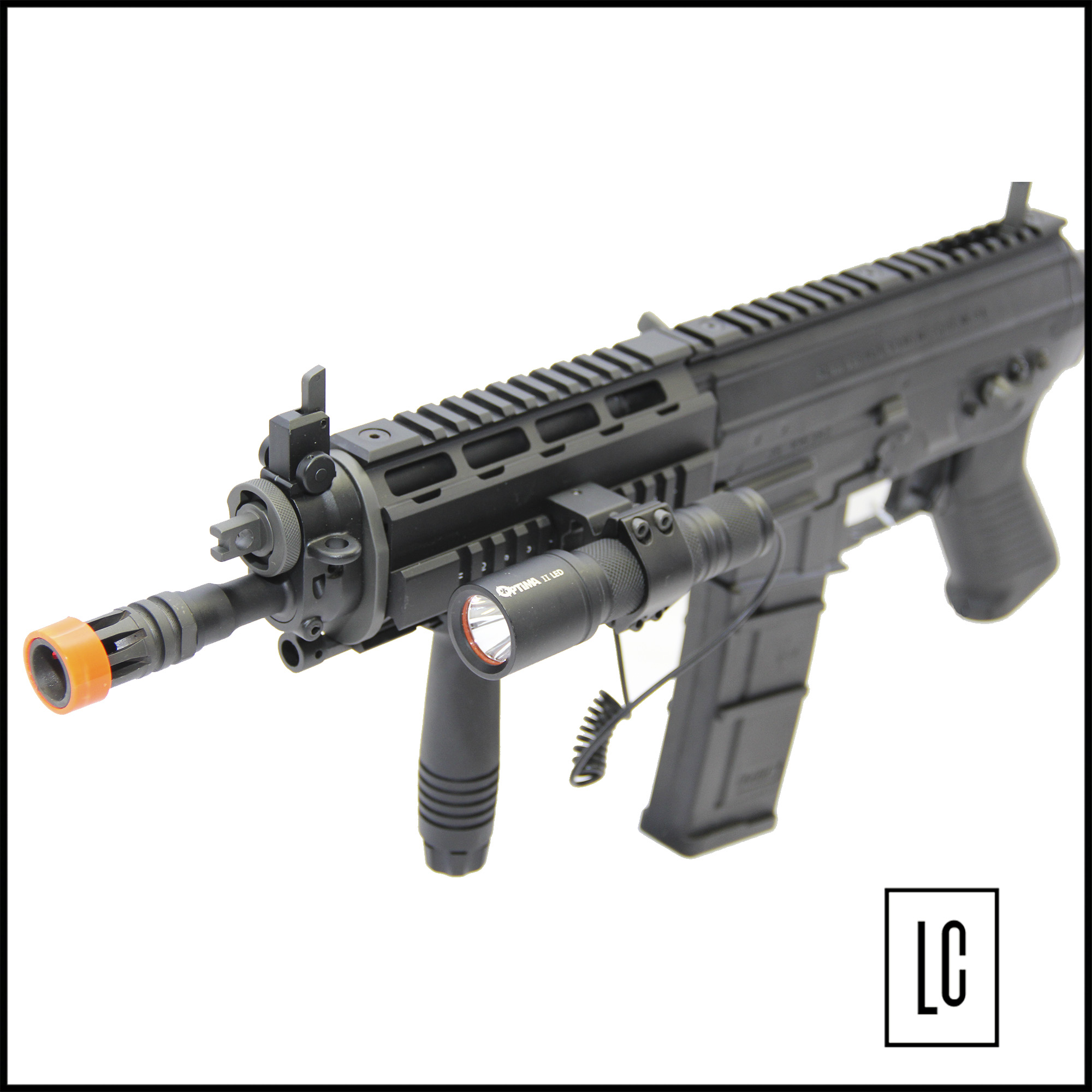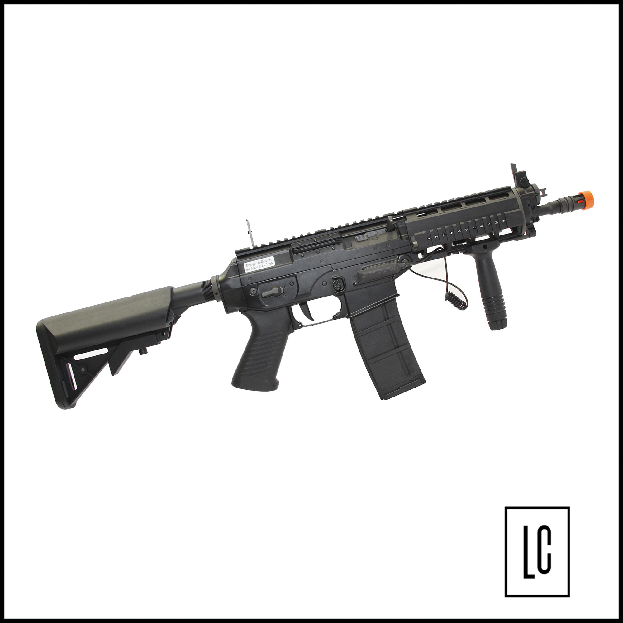 RIFLE DE AIRSOFT SIG SAUER 556 SHORTY* é um modelo de rifle de assalto. Possui coronha retrátil onde é possível ajustar o comprimento do equipamento para melhor ajuste do atirador. Possui mira regulável, alças para adaptação de bandoleira, sistema de disparo automático, semi-automático e trava de segurança, sistema de Hop-Up ajustável BAXS System e sistema com trilhos no handguard, acompanha lanterna com acionamento rapido, front grip e 2 magazine extras.