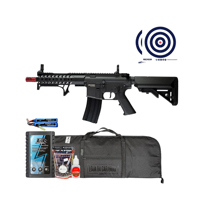 Mega Combo completo! Acompanha Capa 90cm LojaDaCarabina para armazenar seu equipamento em segurança, BBs 0.25g NTK para municiar seu rifle airsoft, Carregador para Bateria LiPo L3, Bateria LiPo 7.4V, Óleo de Silicone para lubrificação e Alvos de Treino Rossi.