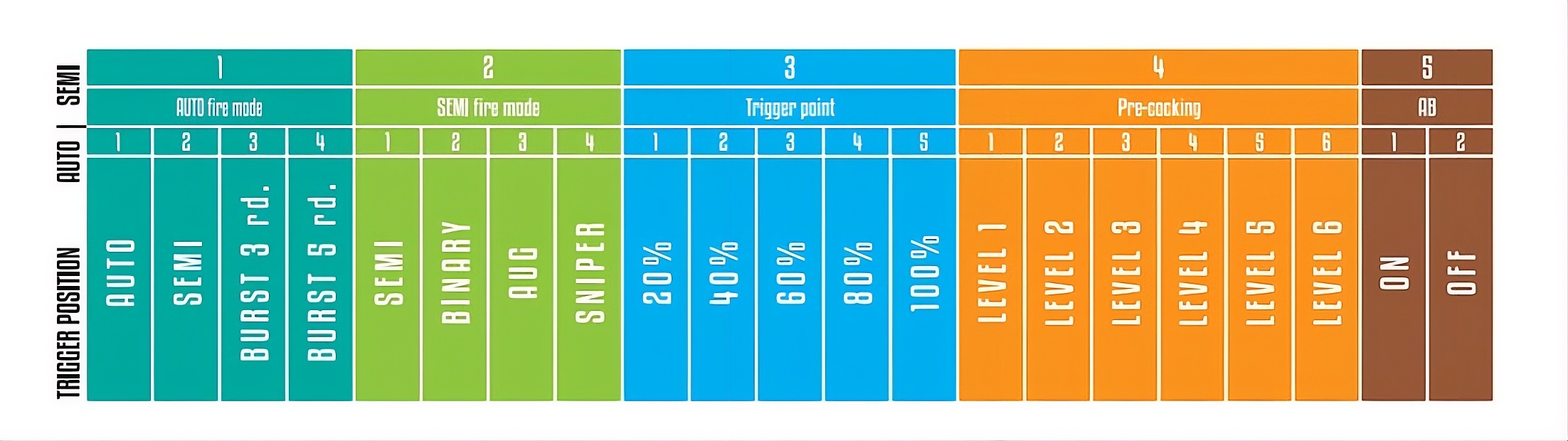 Abaixo o esquema de configurações disponíveis no gatilho HAL da Specna Arms