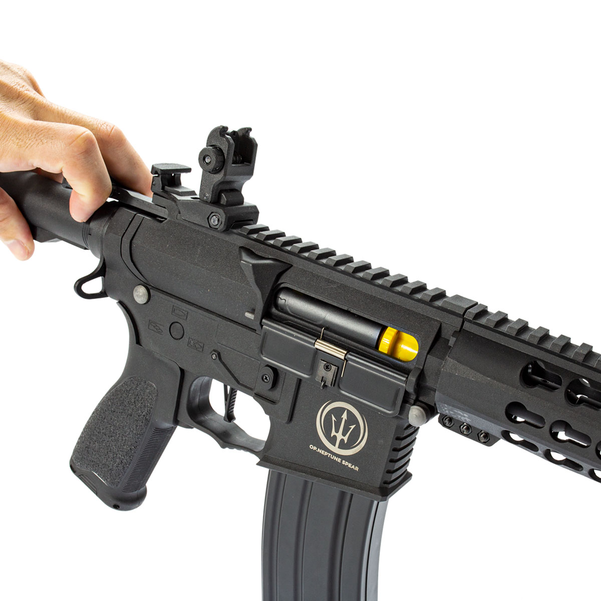 Possui handguard de 10 polegadas com trilhos keymod e picatinny na parte inferior, possibilitando o uso de diversos acessórios nessa AEG. Também possui trilho superior de 20 mm picatinny para instalação de red dot ou luneta.