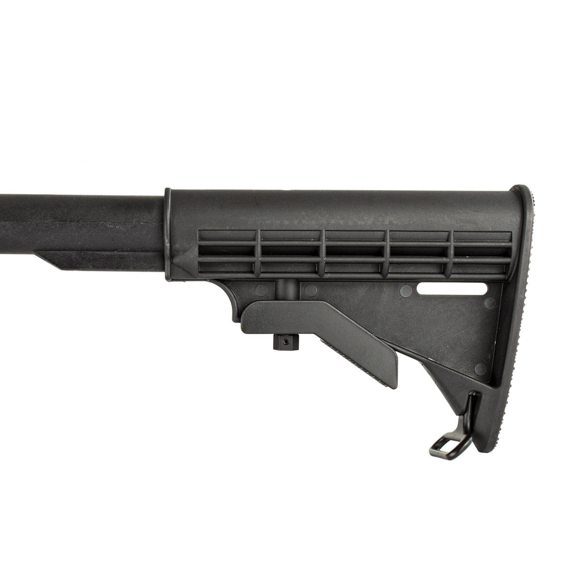 Possui coronha retrátil que permite o ajuste do comprimento entre 98cm até 108cm, oferecendo maior conforto ao operador.