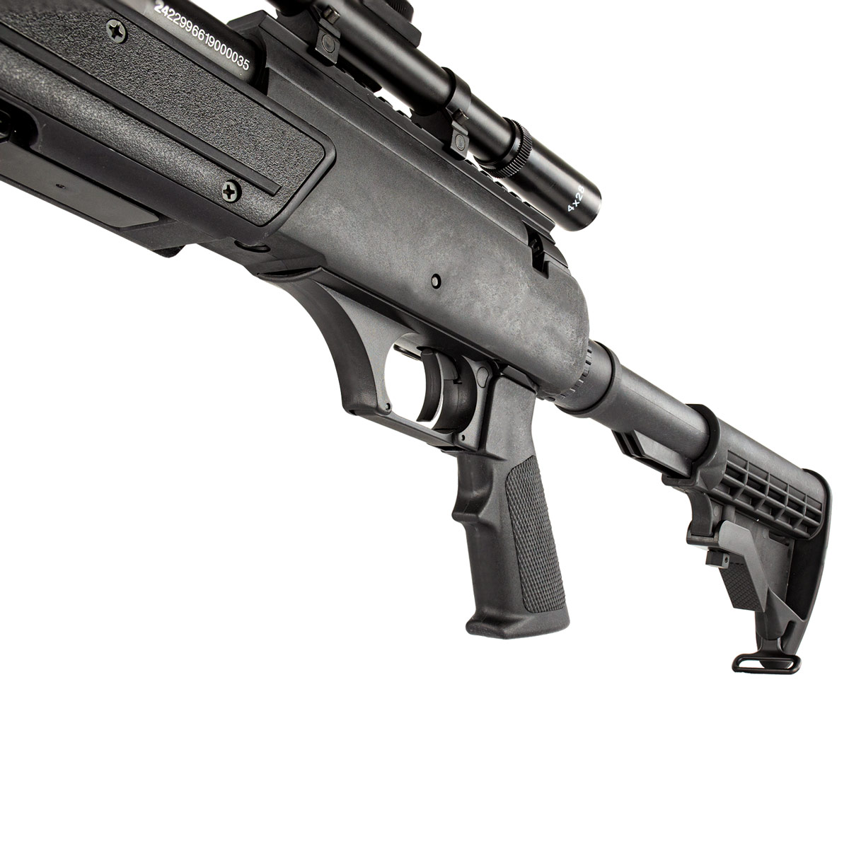 Acompanha uma luneta 4x28 que pode ser instalada facilmente no trilho superior da arma. Essa luneta possui um tubo com formato interno oblongo e também conta com ajuste vertical e horizontal por chave.