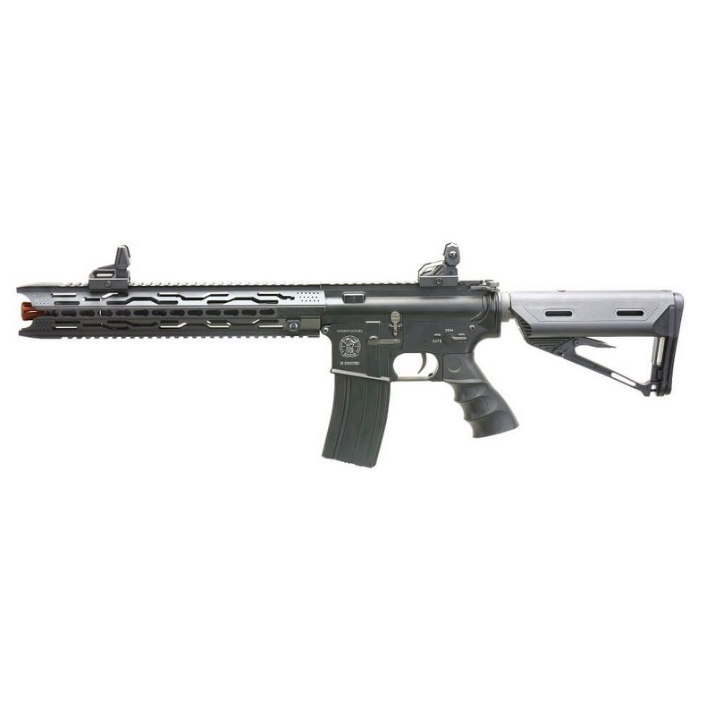 Seu handguard conta com trilho Ris 22mm e trilho Keymod para fixação de acessórios, implementando ainda mais o estilo dessa AEG.
