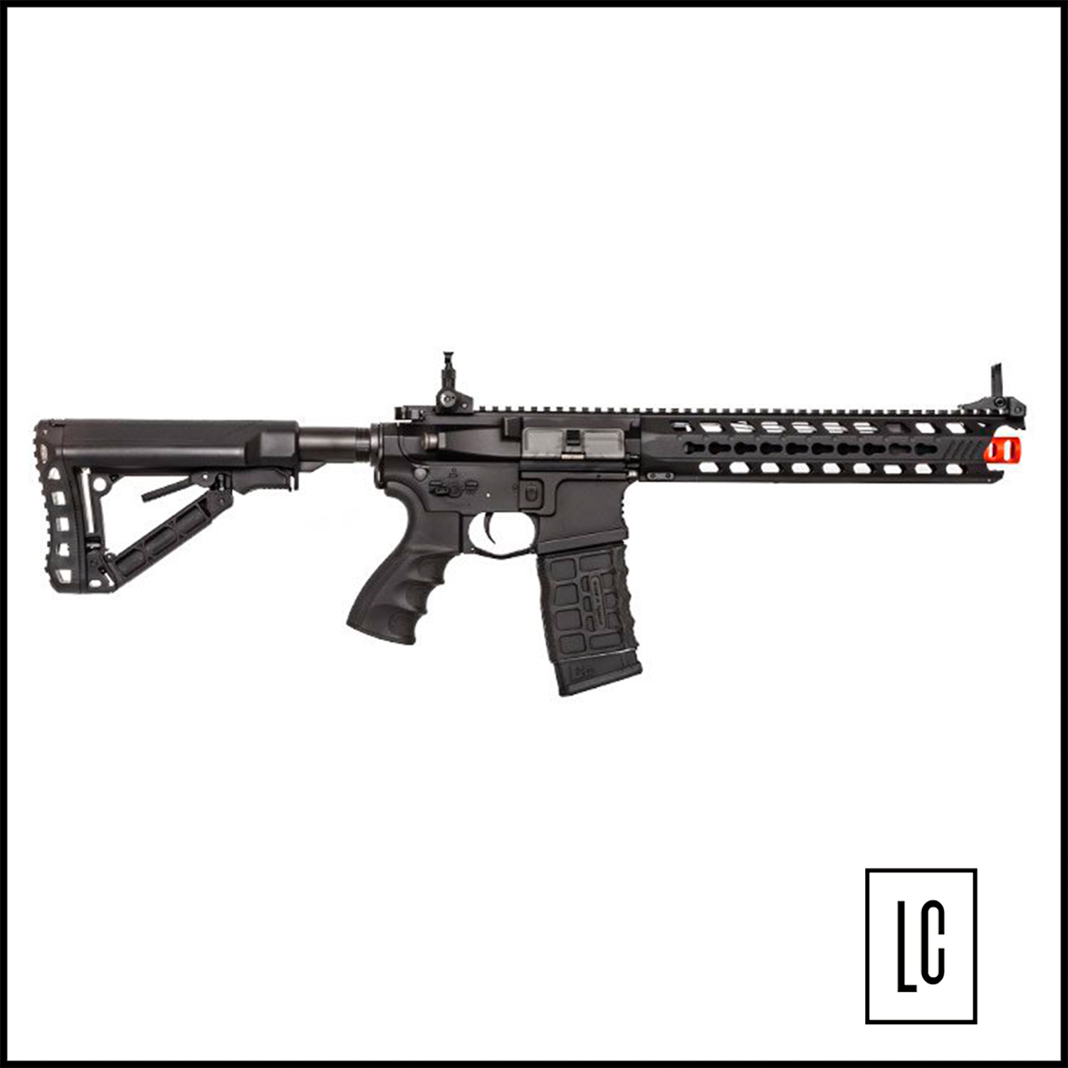 Modelo Full Metal da G&G Predator. Um dos diferenciais deste rifle da linha G&G é contemplar o sistema MOSFET mais o sistema ETU (Unidade de gatilho eletrônico), que possibilitam ao jogador programar os disparos no modo automático (PROGRAMAÇÃO DE RAJADA-3 TIROS).