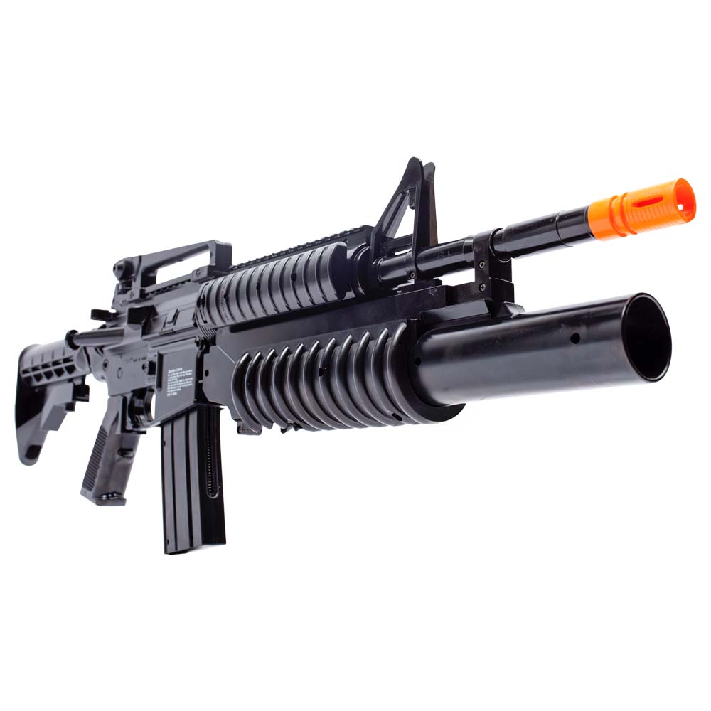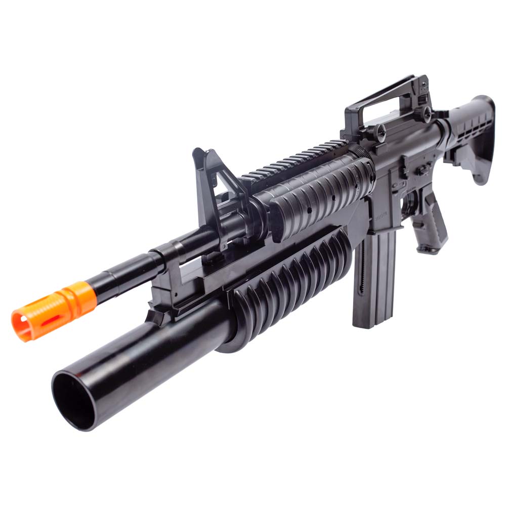 Possui lança granada M203, não funcional, porém que deixa o visual do rifle muito bacana e mais robusto. Ele funciona com o sistema pump, permitindo engatilhar o rifle.