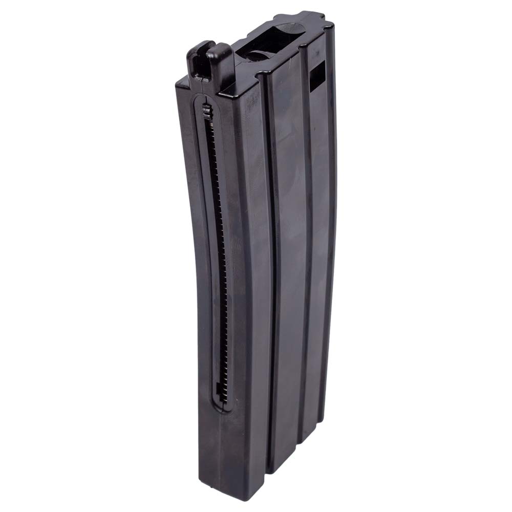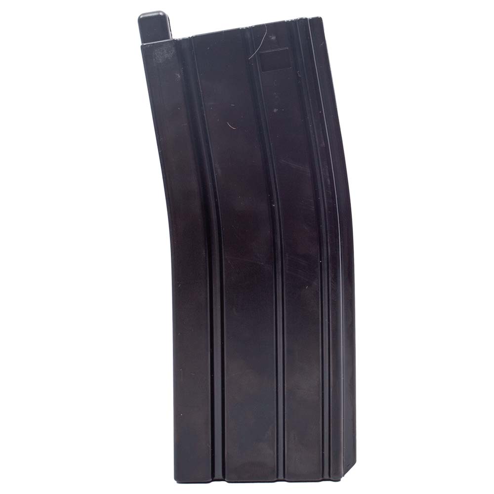 Utiliza um magazine de plataforma M4 do tipo mid cap que tem capacidade para até 18 esferas no calibre 6 mm.