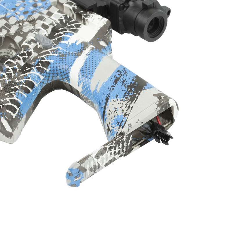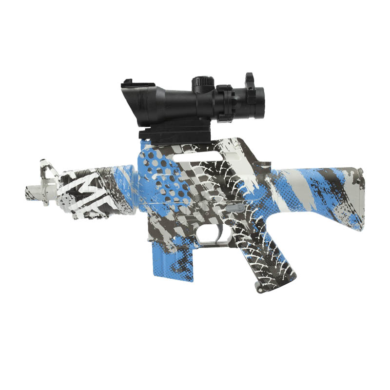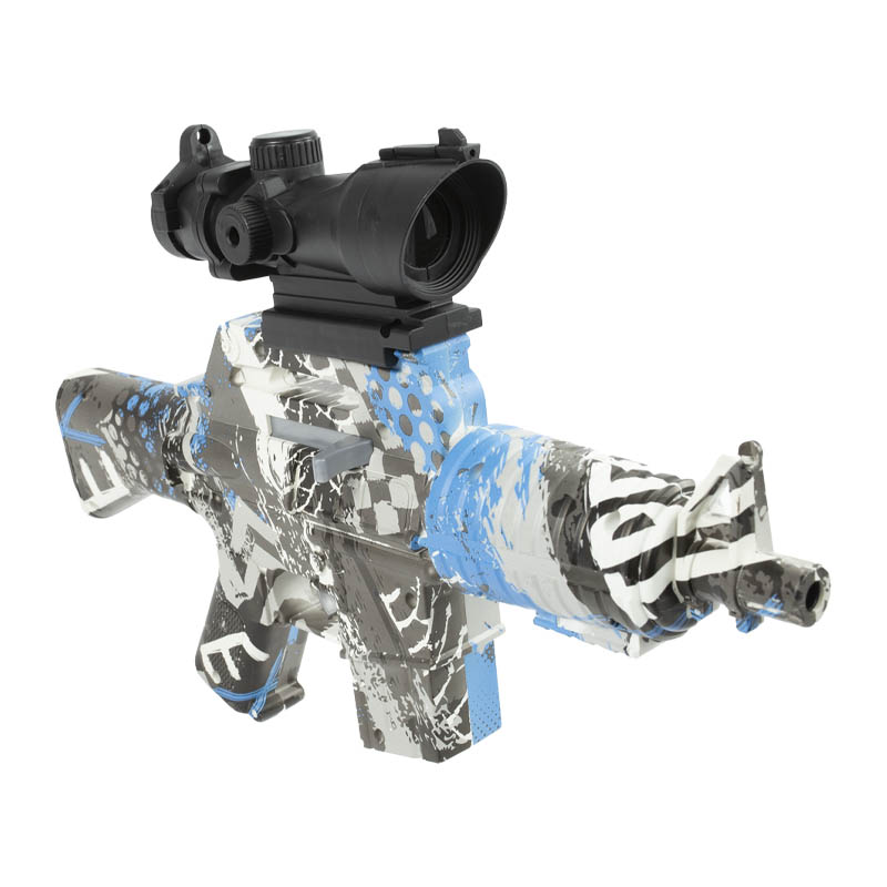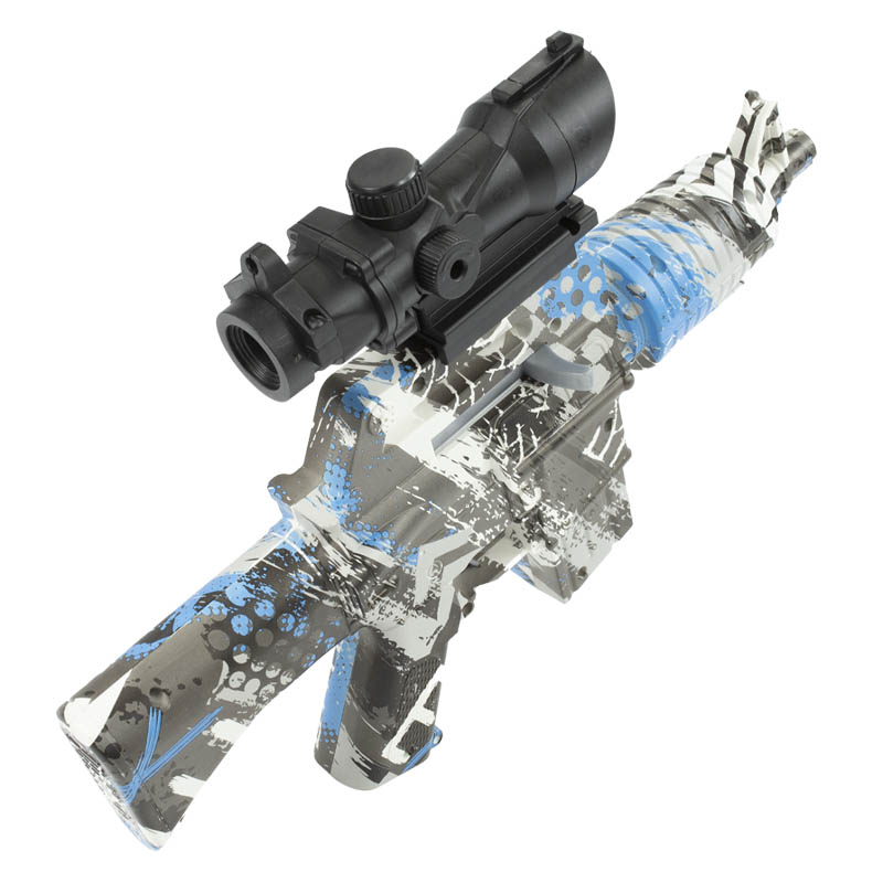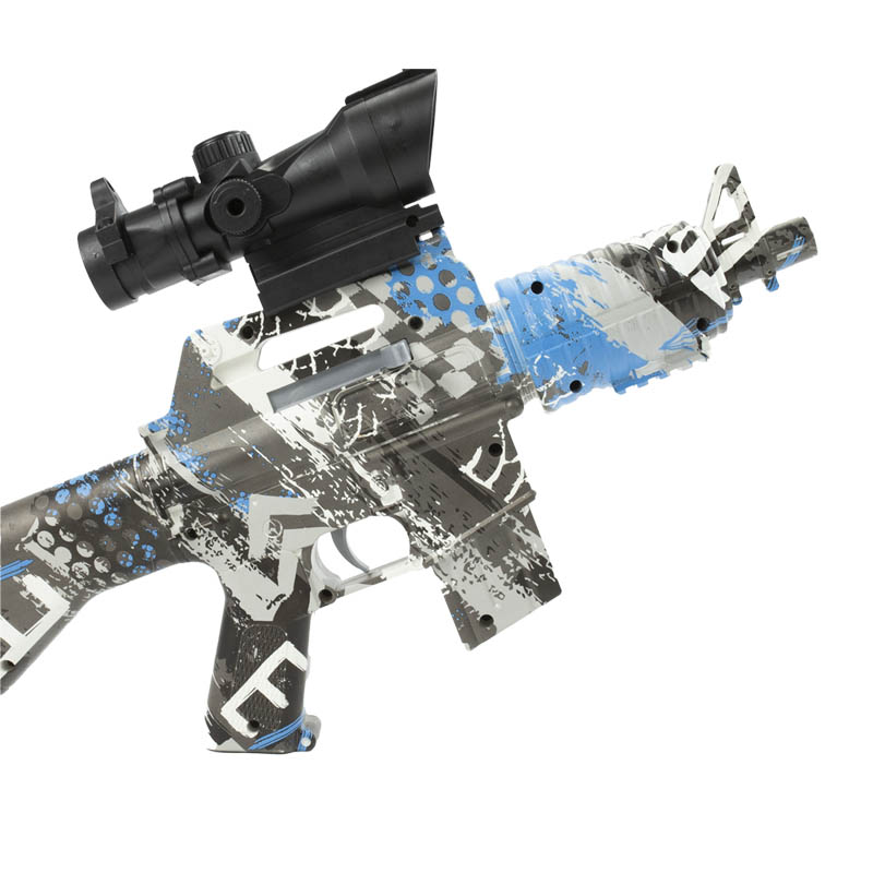 Chegaram às Gel Blaster da Rossi! Rifle Elétrico de gel modelo M4 com estampa nas cores azul, preto e branco.