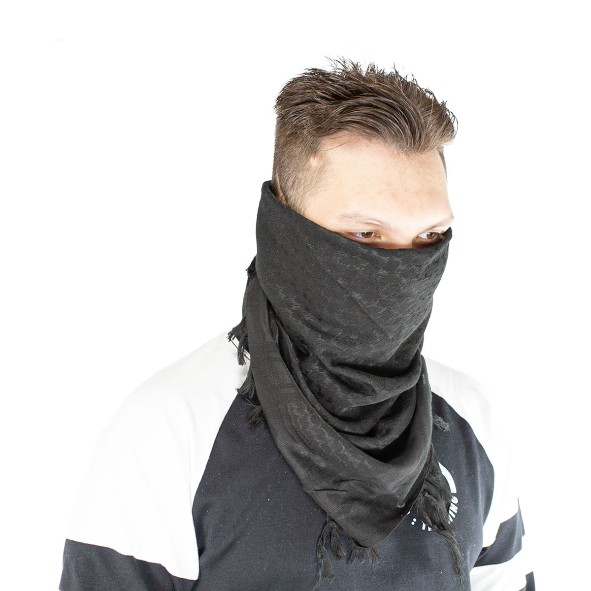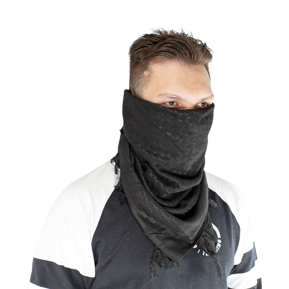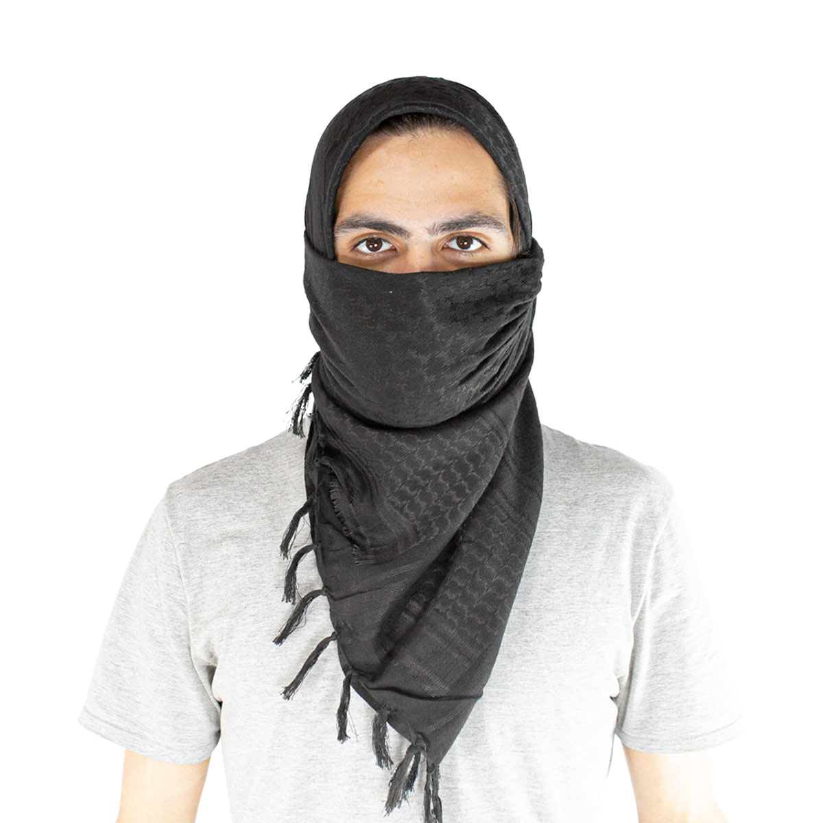 Lenço Shemagh na cor preta , fabricado em Poliéster e algodão o lenço shemagh pode ser usado como cachecol, mascara, bandana, echarpe entre outras utilidades, adquira agora o seu Shemag aqui na Loja da Carabina.