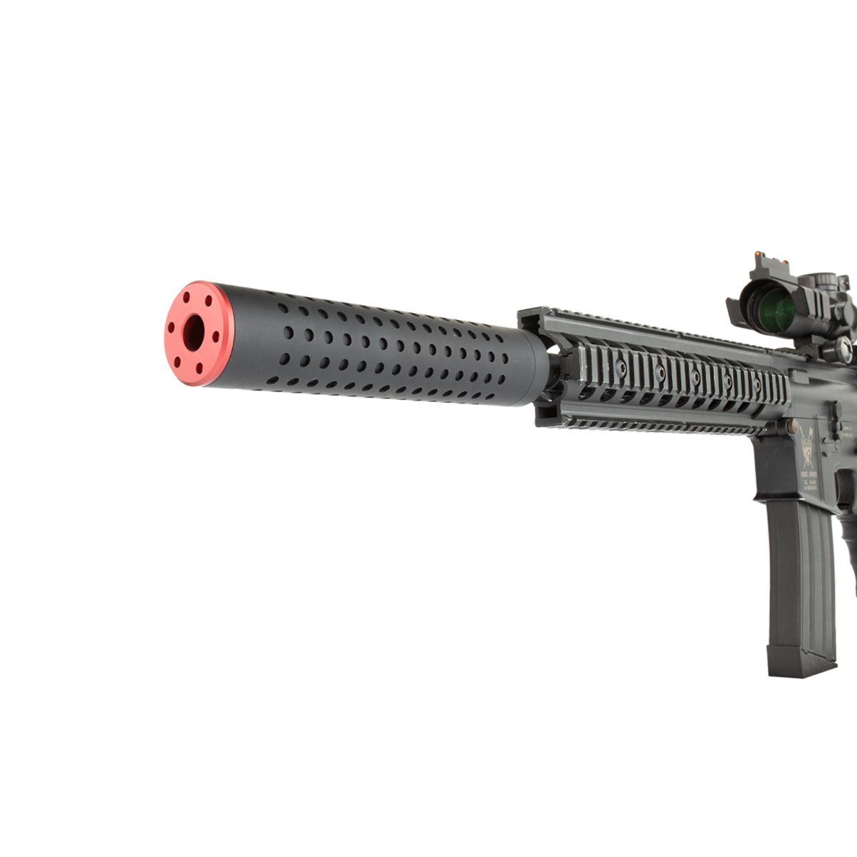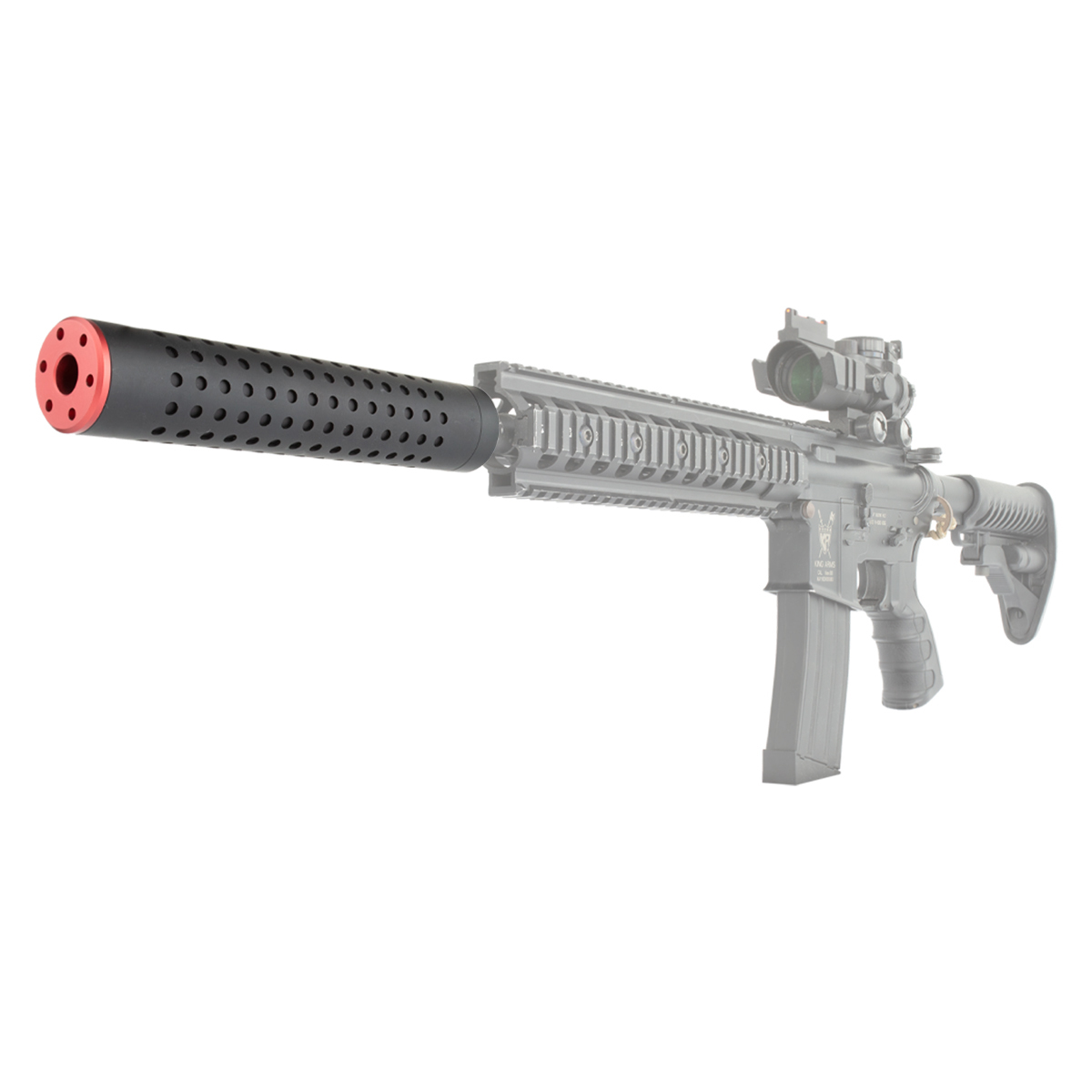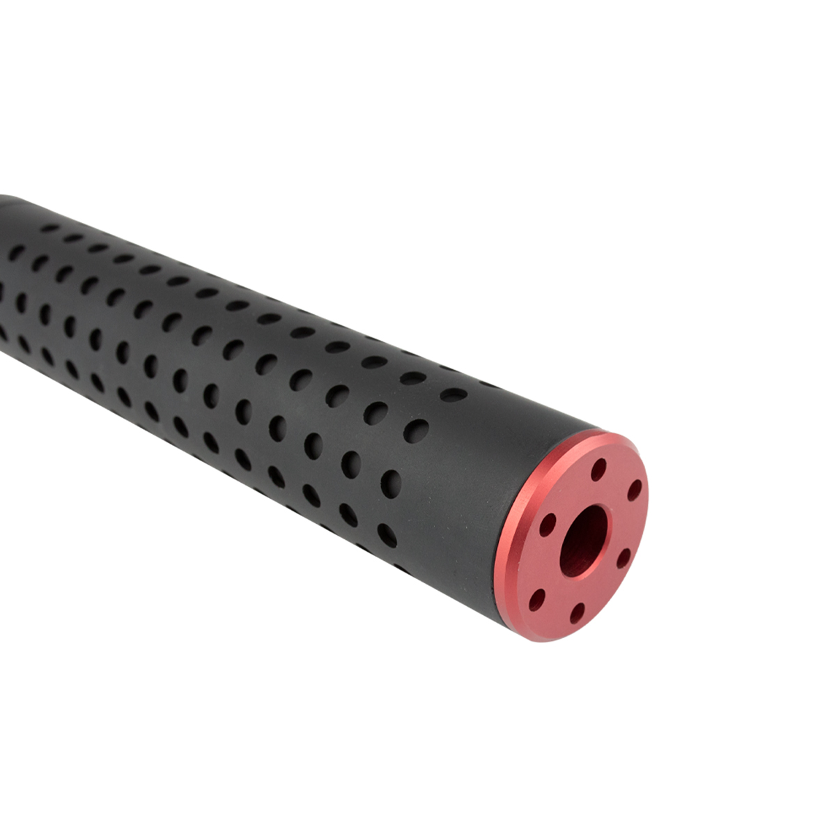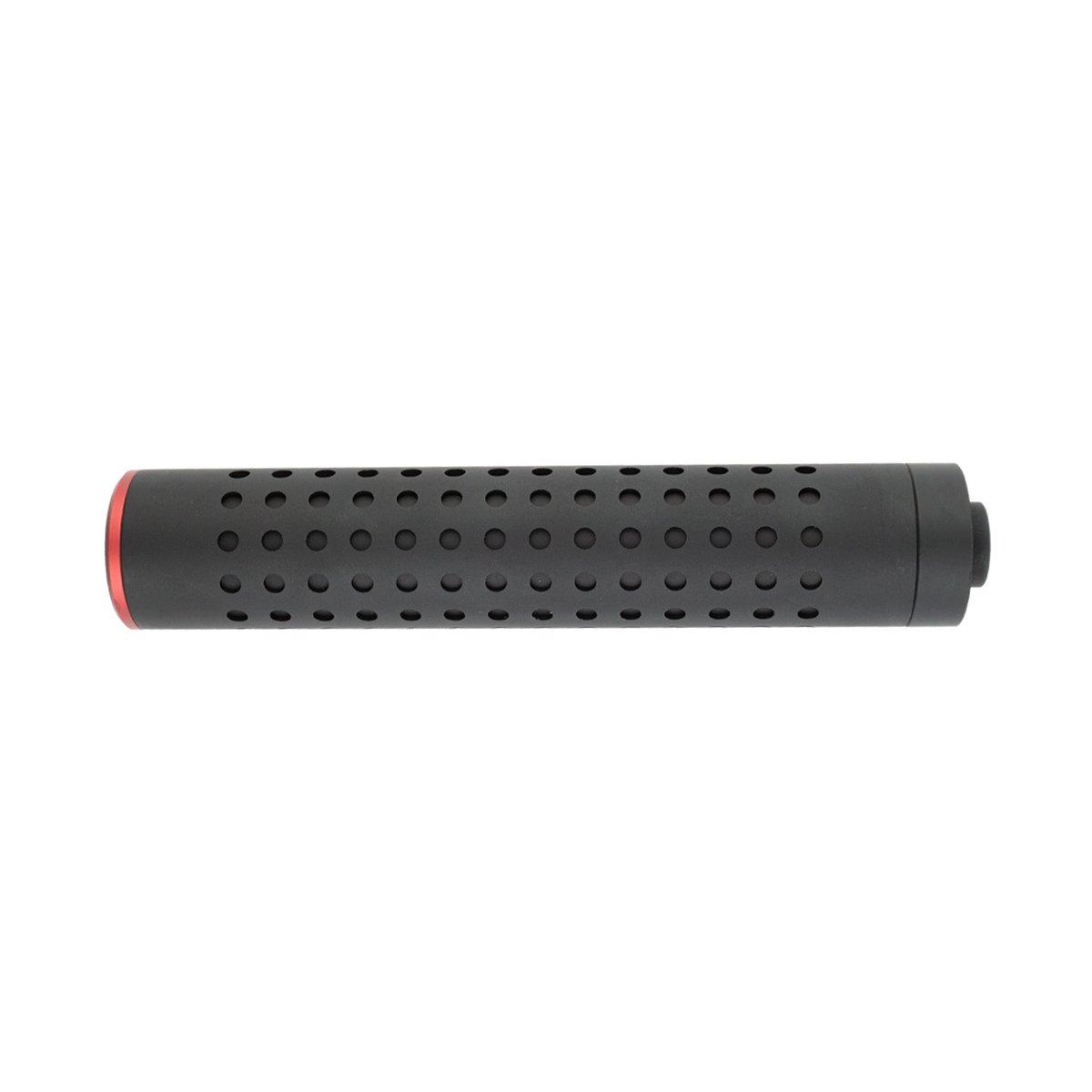 Silenciador Airsoft 38mm x 200mm Rosca 14mm Esquerda CCW, fabricado em alumínio na cor preta com ponta vermelha e parte interna com espuma.