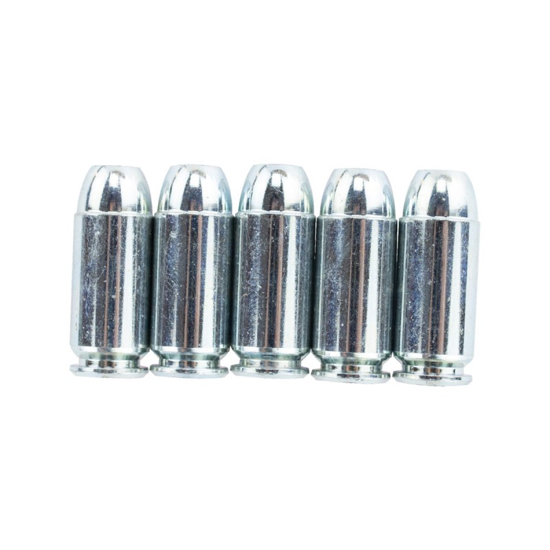 Munição de manejo tamanho real calibre .40. Contém 5 unidades. Serve muito bem para treinamentos pois os tamanhos dos projéteis são reais e fabricados justamente para estes fins. Todas as munições de manejo possuem o batente em borracha. Por isso você pode usar para treinos tranquilamente, pois não irá ocasionar o desgaste do percussor ao efetuar o disparo. Lembrando: Munições de manejo servem apenas para fins de treinamento, não sendo efetivas para o disparo pois não possuem nenhum tipo de acionamento. Ref.: 6780
