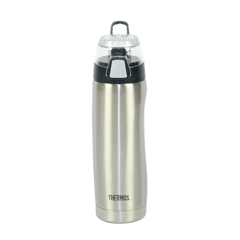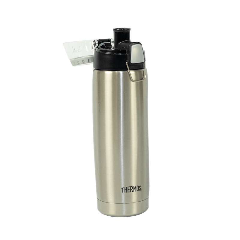 Squeeze Térmico Havaí prata de 530mL, produzido pela marca Thermos, prático e ideal para se refrescar e se hidratar após as atividades físicas.